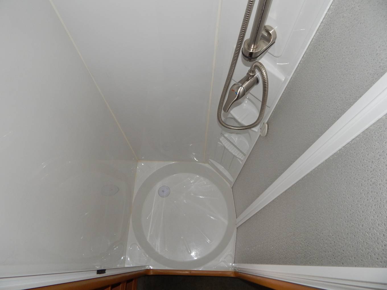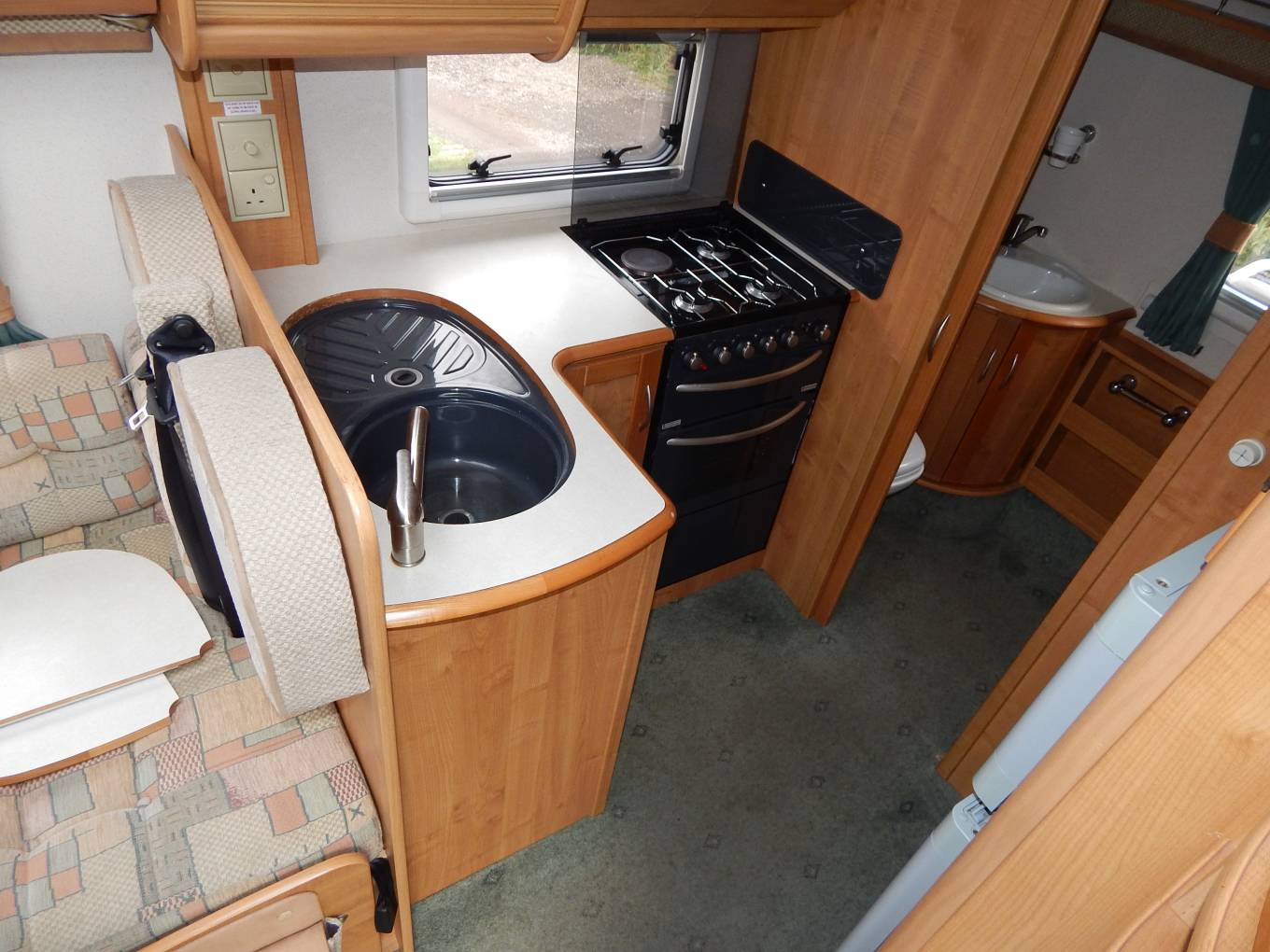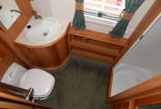 The large end washroom has a fabulous separate shower cubicle with folding Perspex door, a built-in washbasin with mixer tap and a Thetford cassette swivelling toilet with electric flush.
