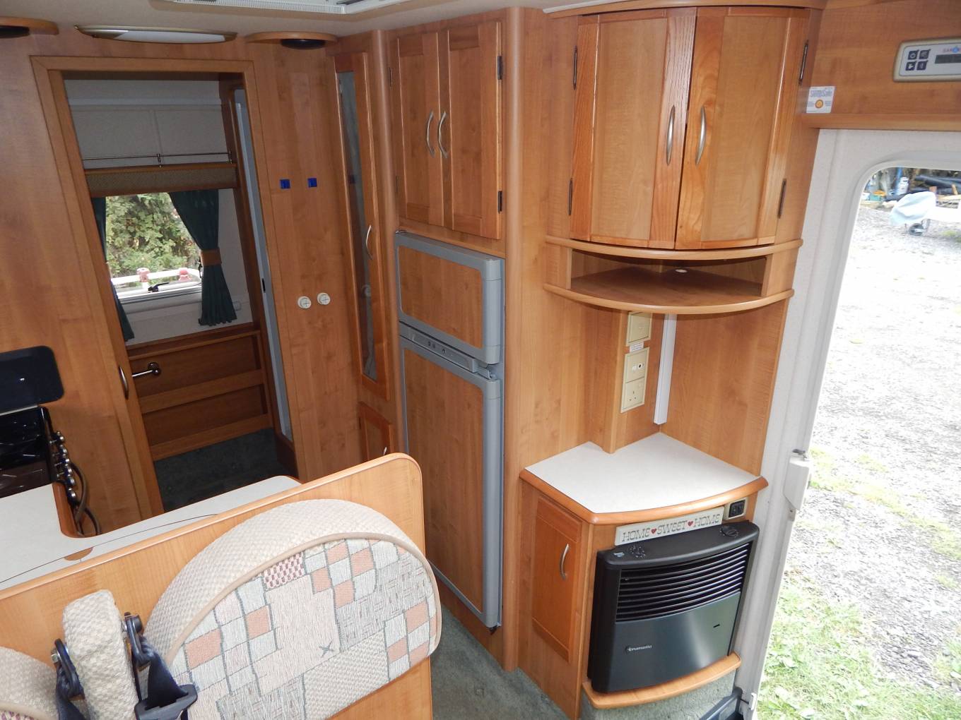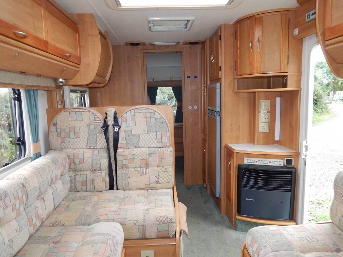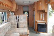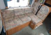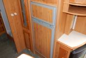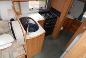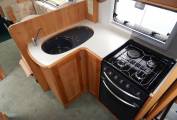 The kitchen has a large sink with draining board, a dual fuel hob with three gas burners and an electric hotplate, gas grill and oven beneath plus a Tall domestic style Thetford fridge with separate freezer. Plenty of lockers and cupboards to store your holiday provisions, plus a large upper cabinet with rolling shutter door and power socket where you could easily fit a microwave oven.