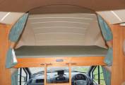 The over-cab bed is large and spacious, access is via a wooden ladder, privacy curtains for night-time and opening windows at each side.