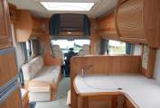 Using the electric step, you enter the motorhome and the lounge or dining area is to your left, an L-Shaped sofa that has two forward facing travelling seats with seatbelts. A second straight sofa runs along the near side, both sofas enjoying storage beneath and there are upper aircraft style storage lockers. A large sunroof floods the area with natural daylight and fresh air. This area converts to a large double bed in the evening.