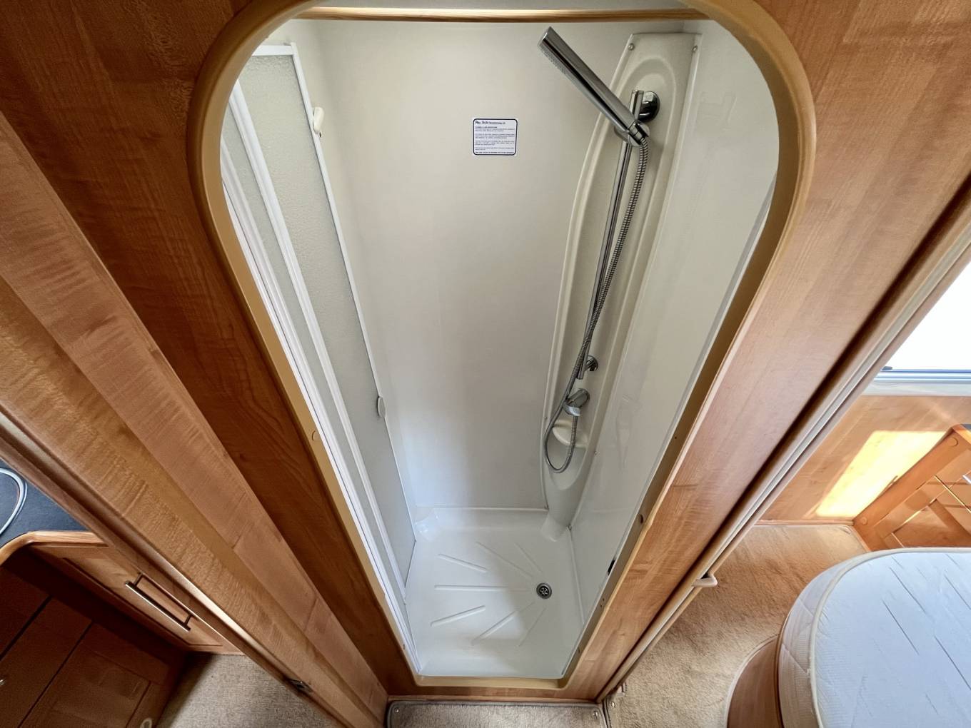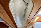 As you exit the bedroom there is a large separate shower room on the right. Opposite this is the very stylish washroom with toilet, basin with mixer tap and storage space above and below. For privacy, either fully extend the toilet door to close the bedroom off at the foot of the kitchen or use the sliding blind at the foot of the bed when sharing the toilet.