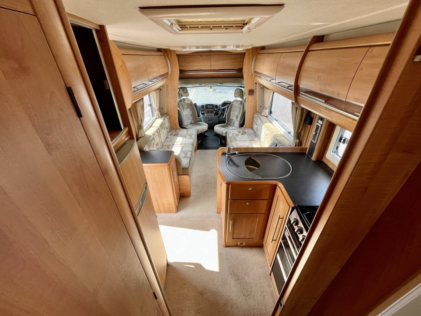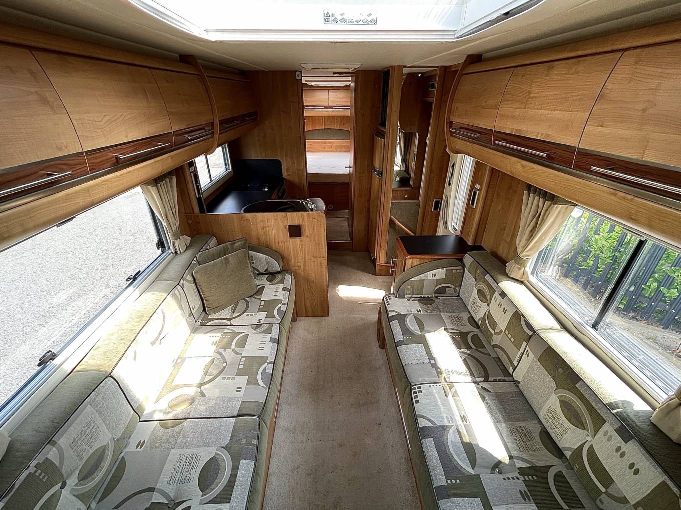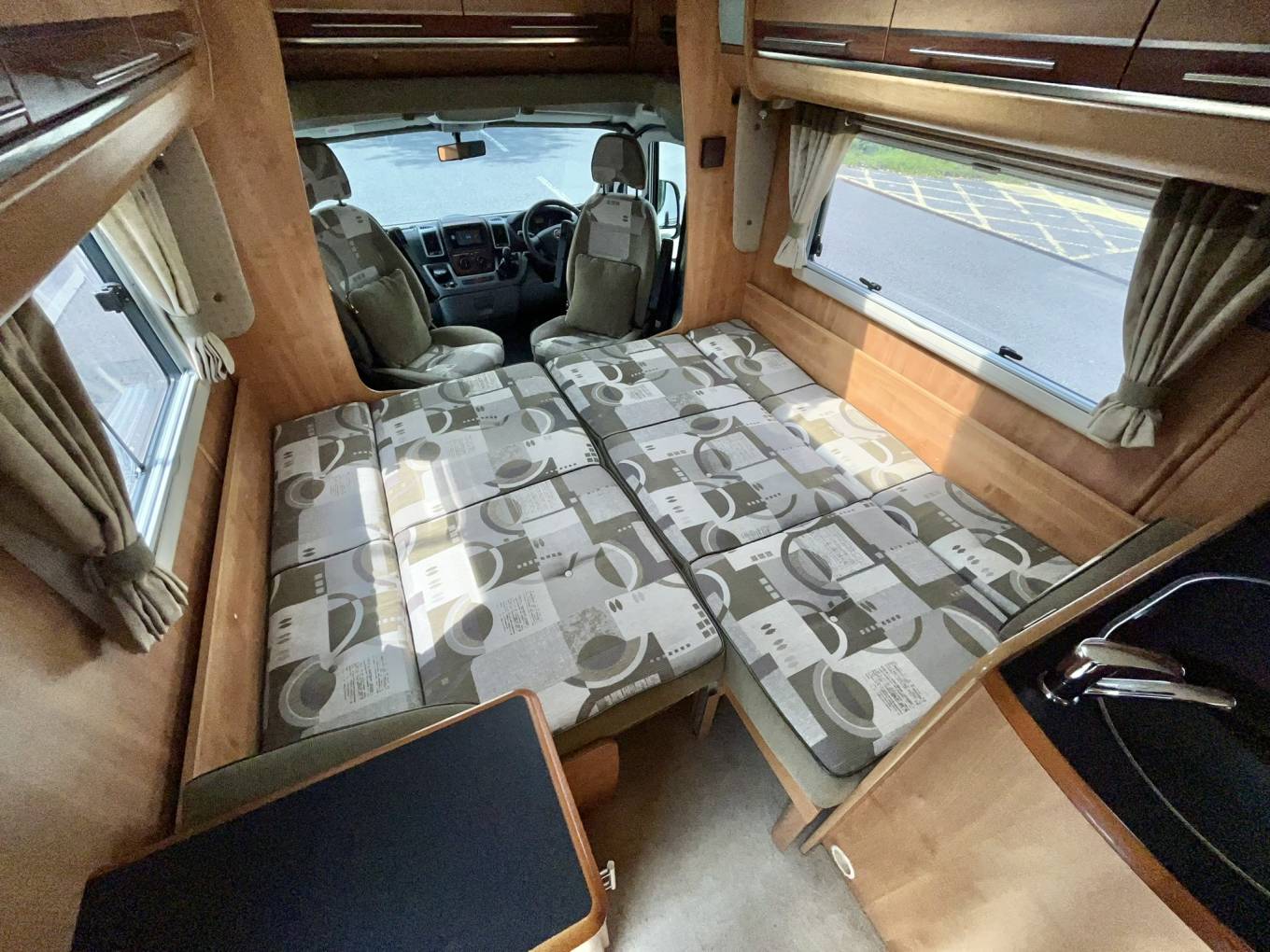 The lounge area is a most delightful spot to enjoy a meal or a glass of wine. There are 2 large side facing sofas finished in a very stylish green upholstery and the large windows throw in loads of light. Add in the freestanding table, spin both the front seat captain's chairs round and you have the perfect dining layout.