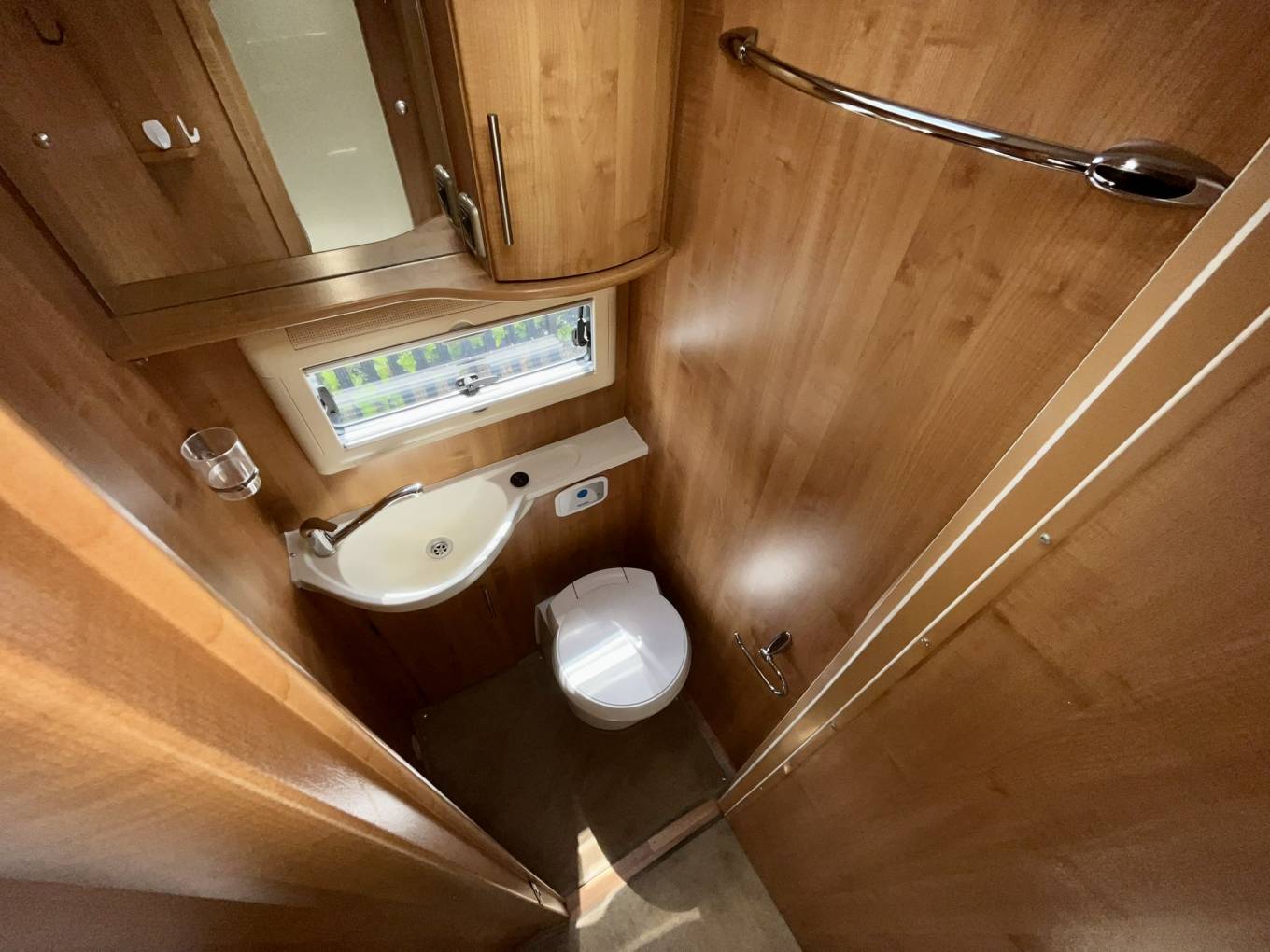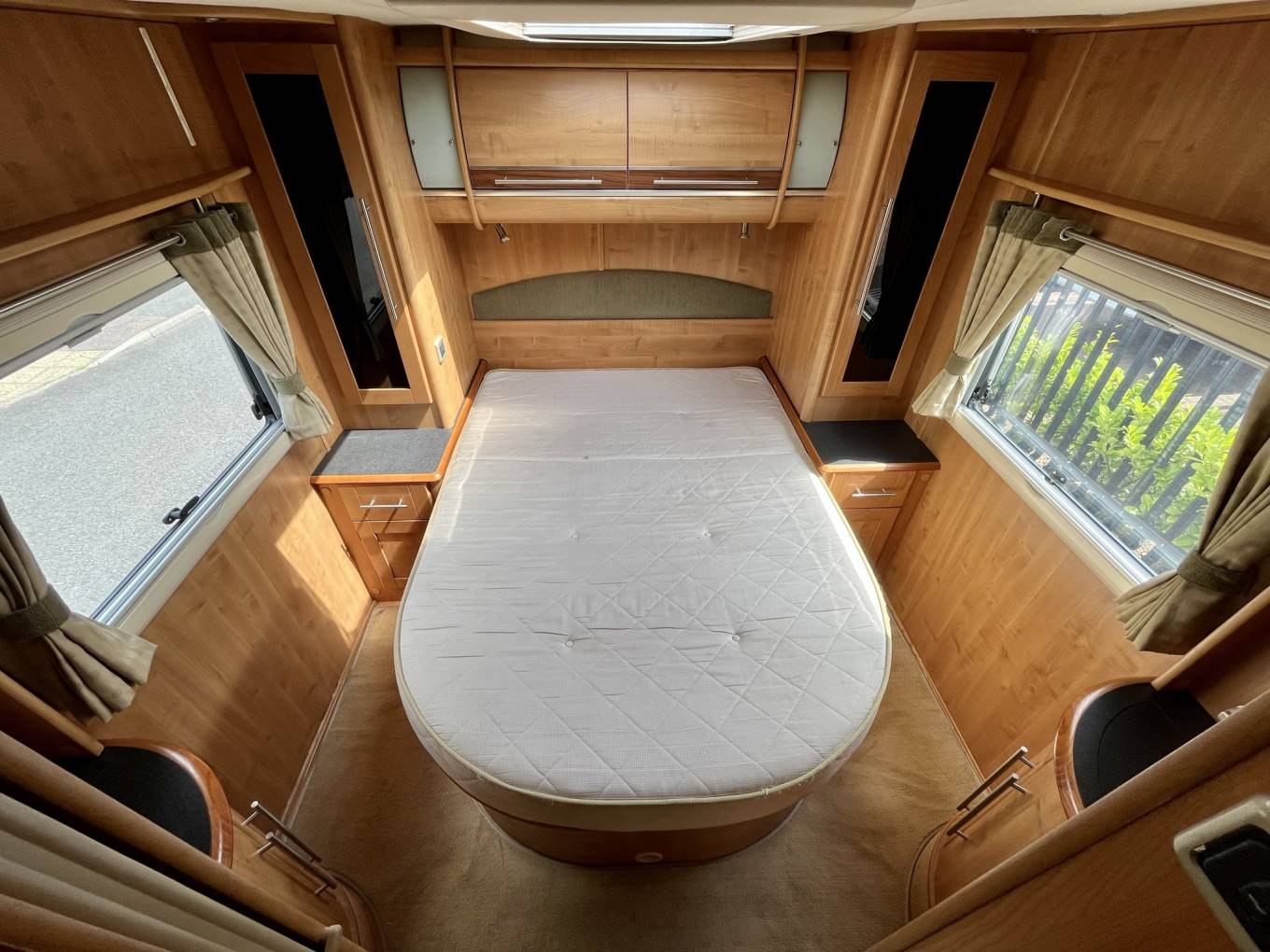 At the rear is the fixed island bed which means two things. Firstly, no making up and putting away the bed each day and secondly no climbing over each other to go to the loo at night. The bedroom is light and airy thanks to the large rooflight and there is wardrobe and drawer space each side of the bed.