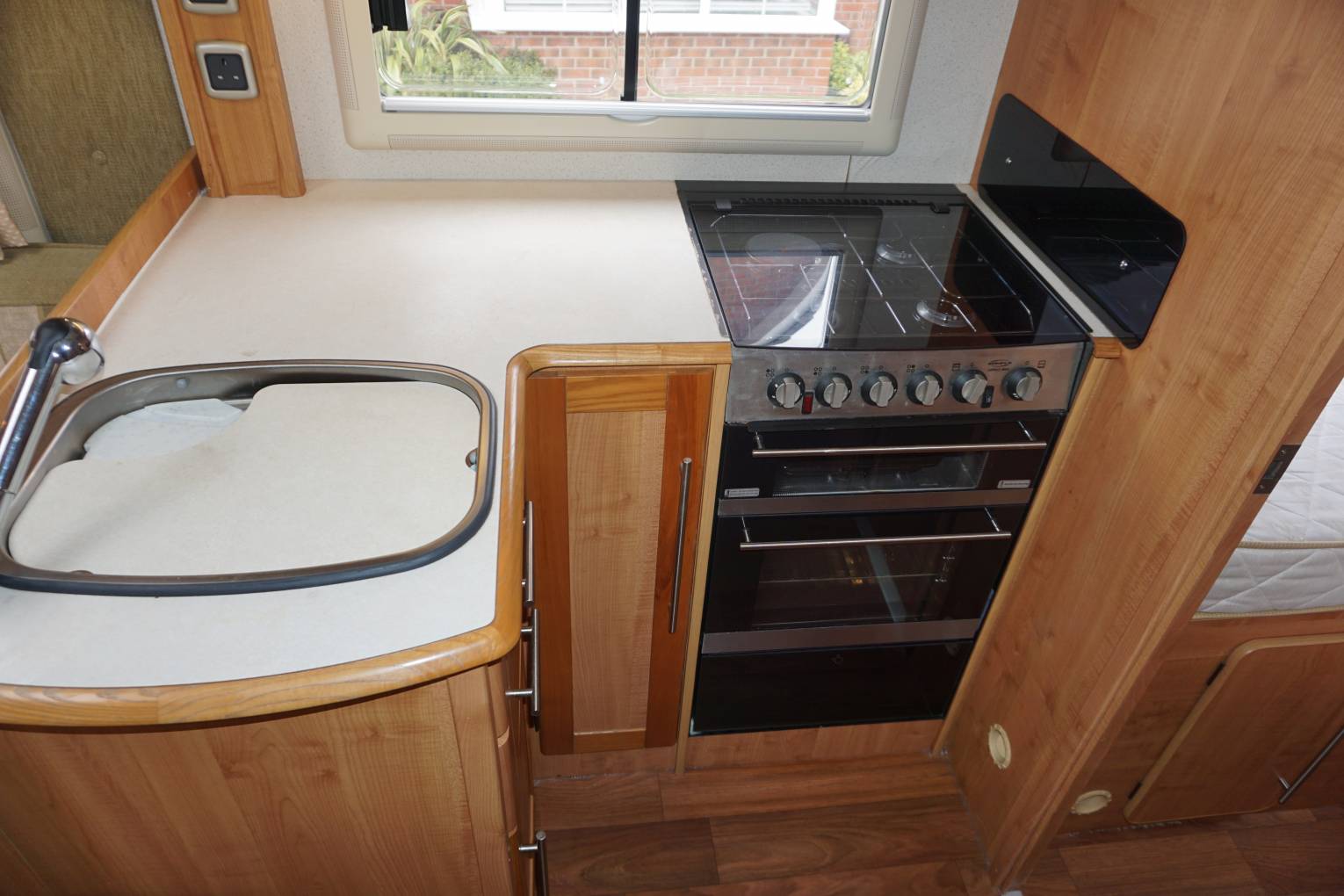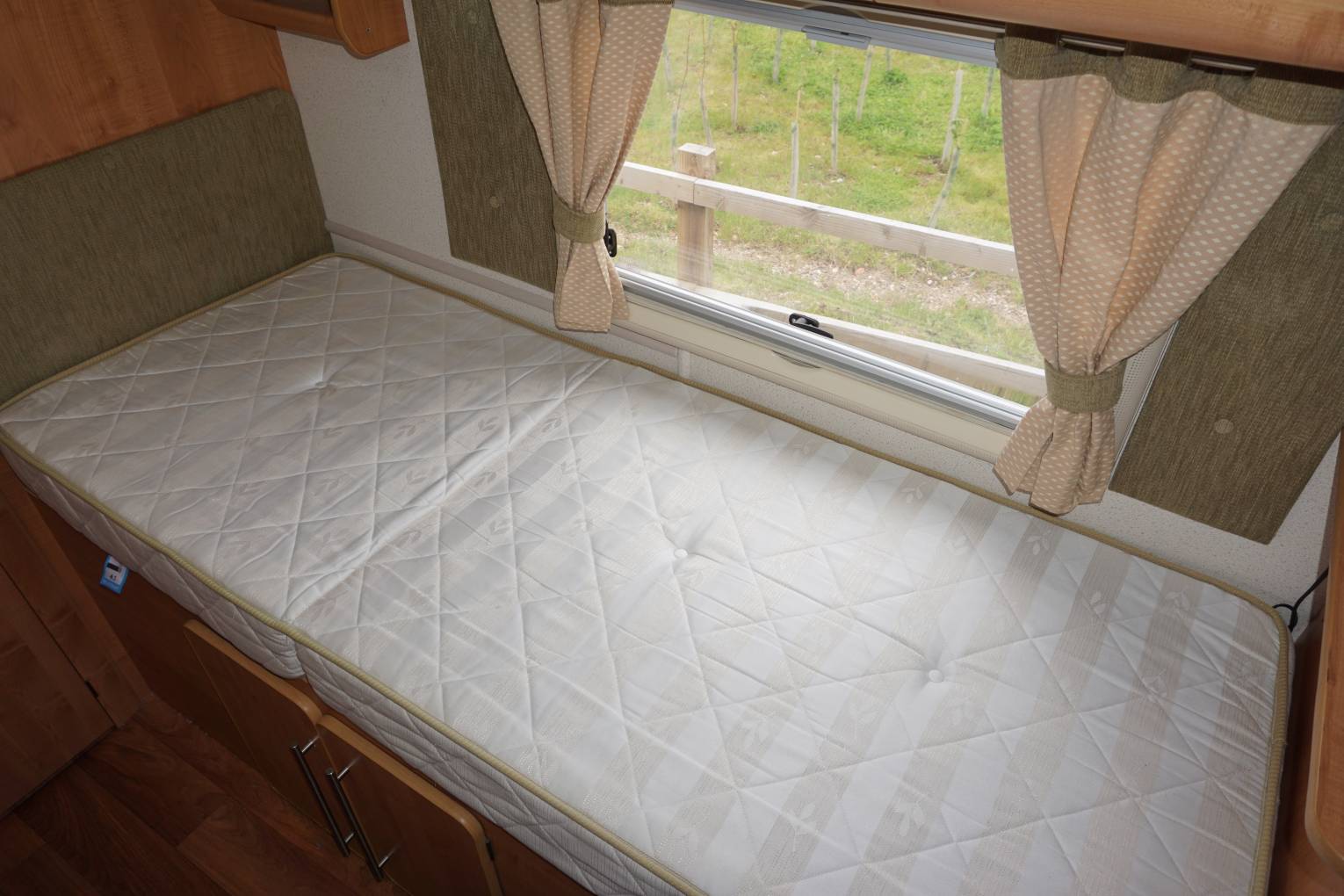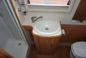 Based on the large Alko chassis it has a rear bathroom with separated shower cubicle, separate badroom with two single beds. Just inside the entrance door is the