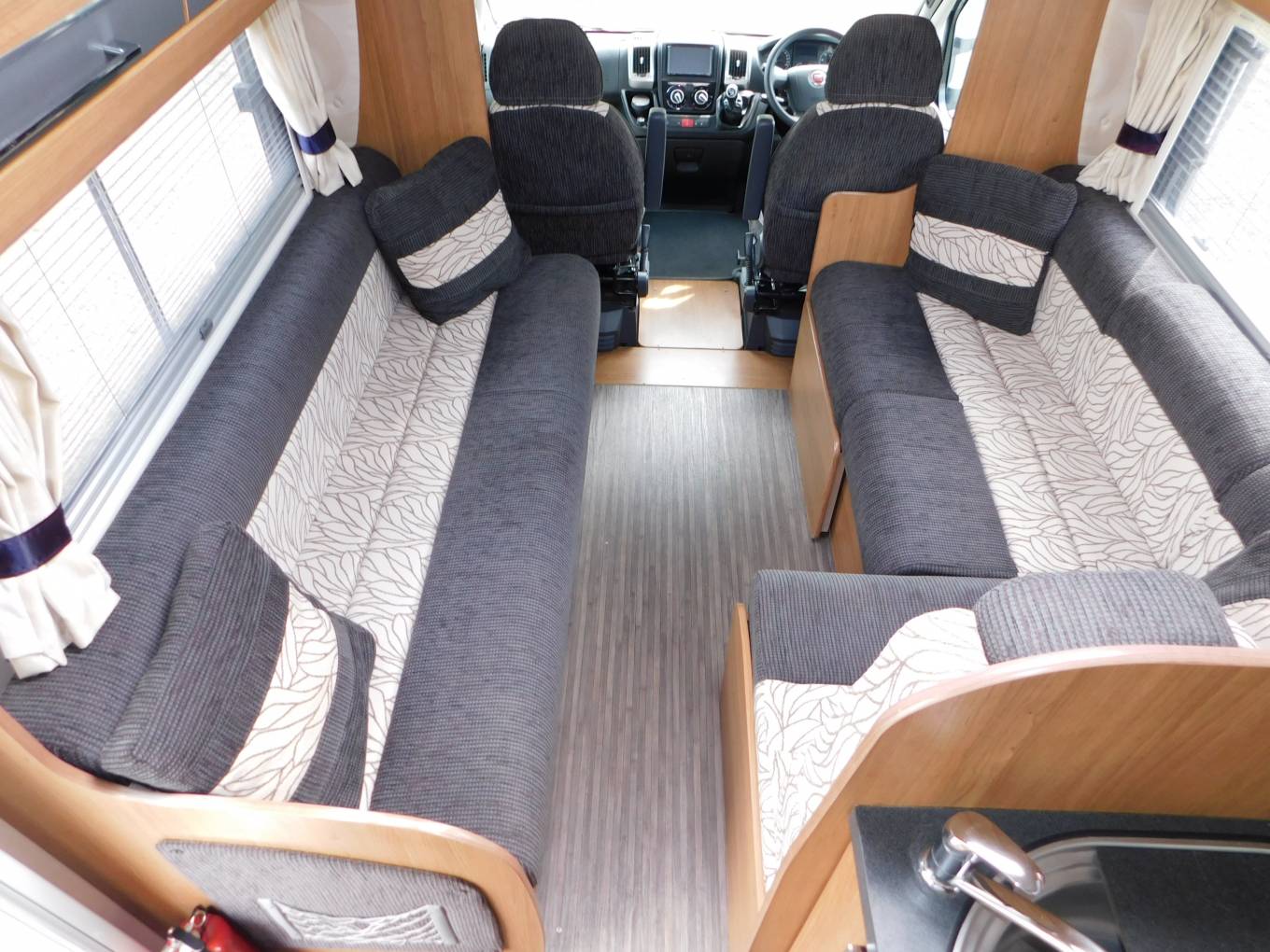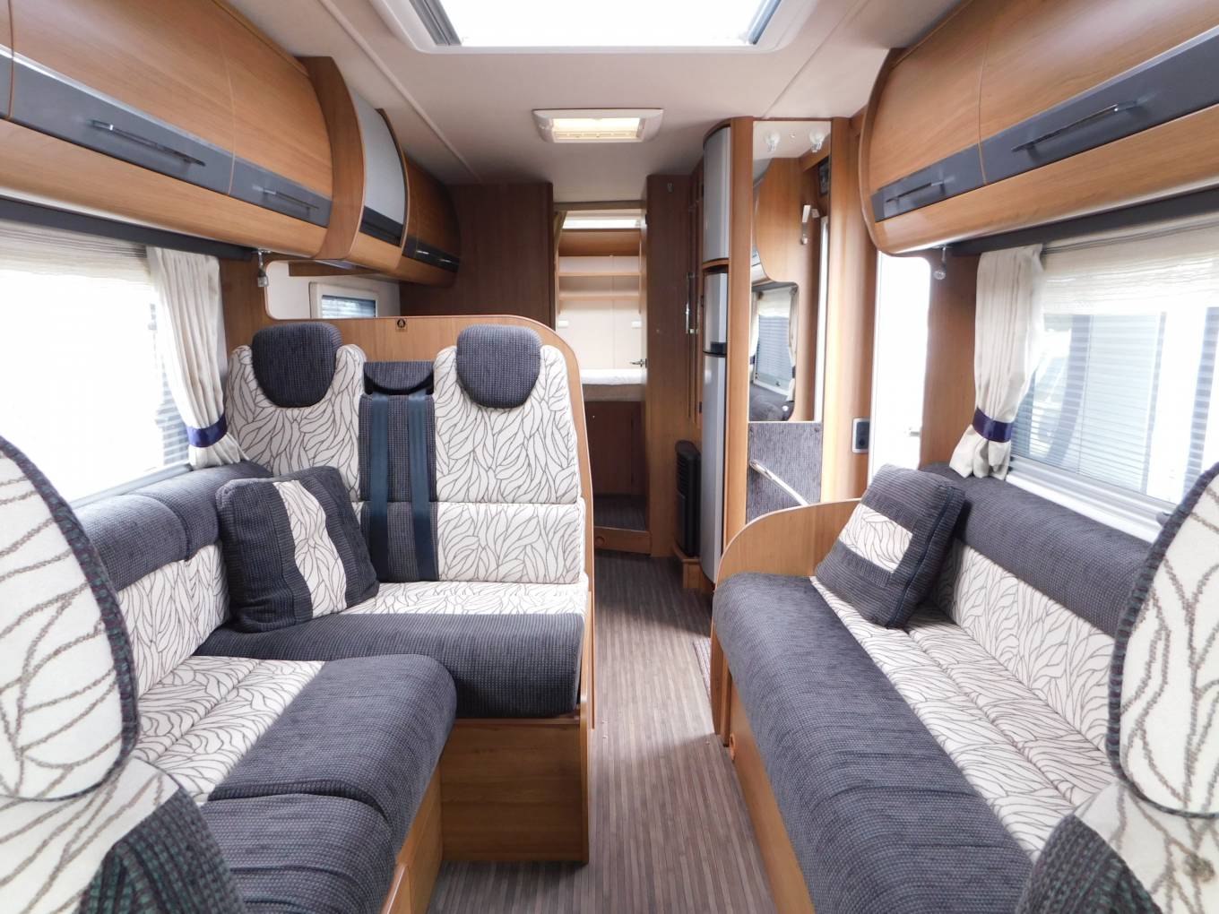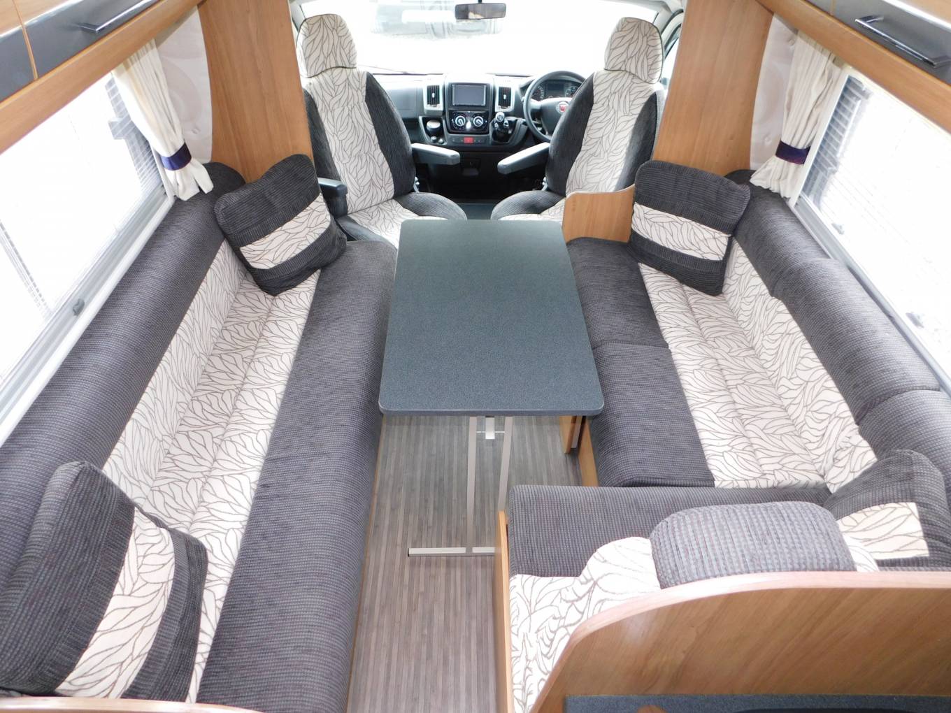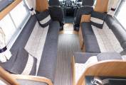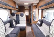 Using the electric step, enter the motorhome and the lounge or dinette area is to your left, with two parallel sofas plus two front facing seats with three-point seat belts, this area converts to a double bed in the evening.