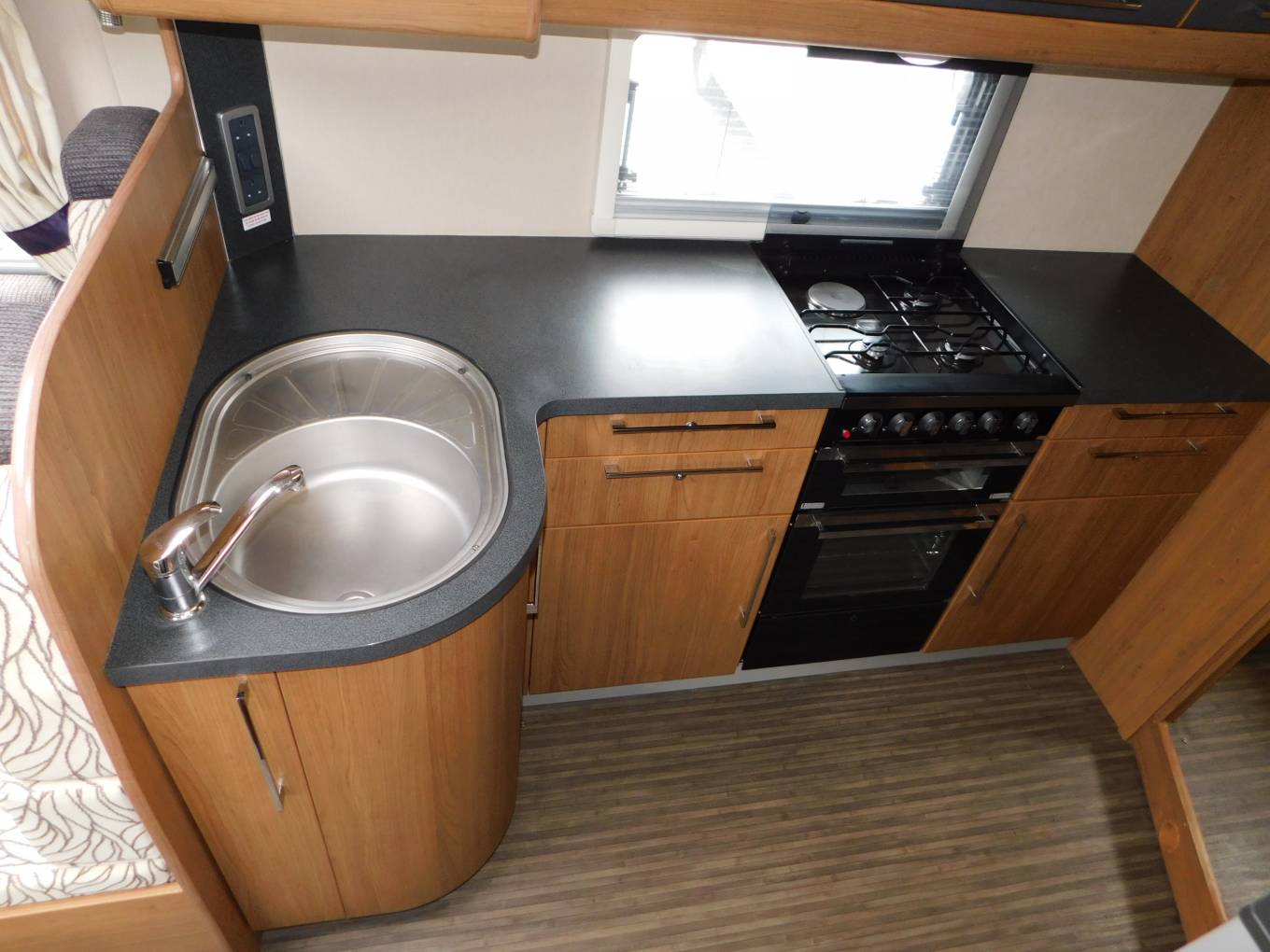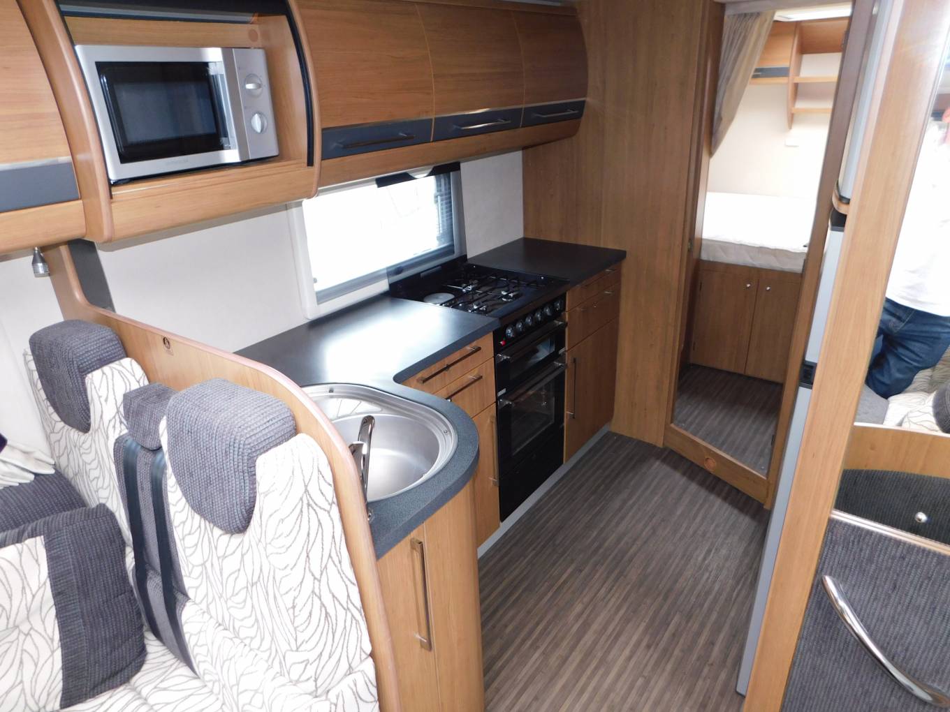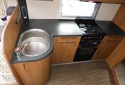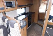The kitchen is well specified with a stainless steel sink and chrome mixer tap, a dual fuel hob with three gas burners and an electric hotplate, gas grill and oven beneath. A full sized fridge with separate freezer that runs on 12v, 230v and gas, above the fridge is large cabinet and opposite is a built-in microwave oven, plus plenty of upper cabinets and lower cupboards to store away your holiday provisions.
