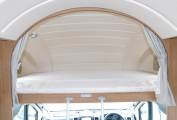 The main feature of this luxurious motorhome is the rear bedroom with sought after fixed double bed, upper aircraft style lockers and a wall mounted Samsung TV. Beneath the bed there are two opening doors to access the large garage storage area, and above a sunroof provides the bedroom with plenty of daylight.