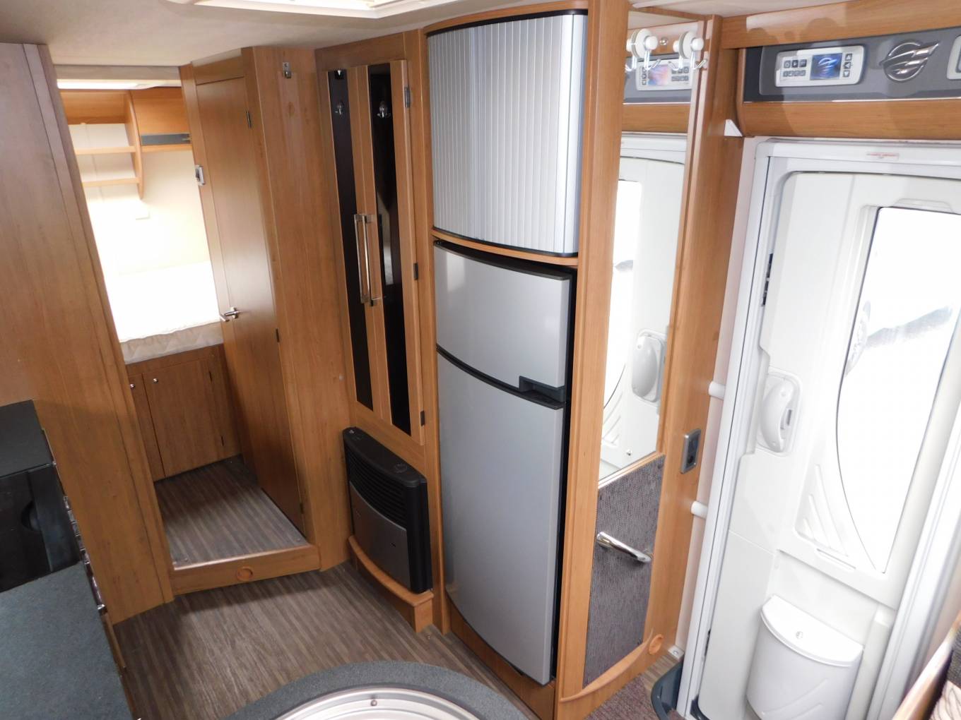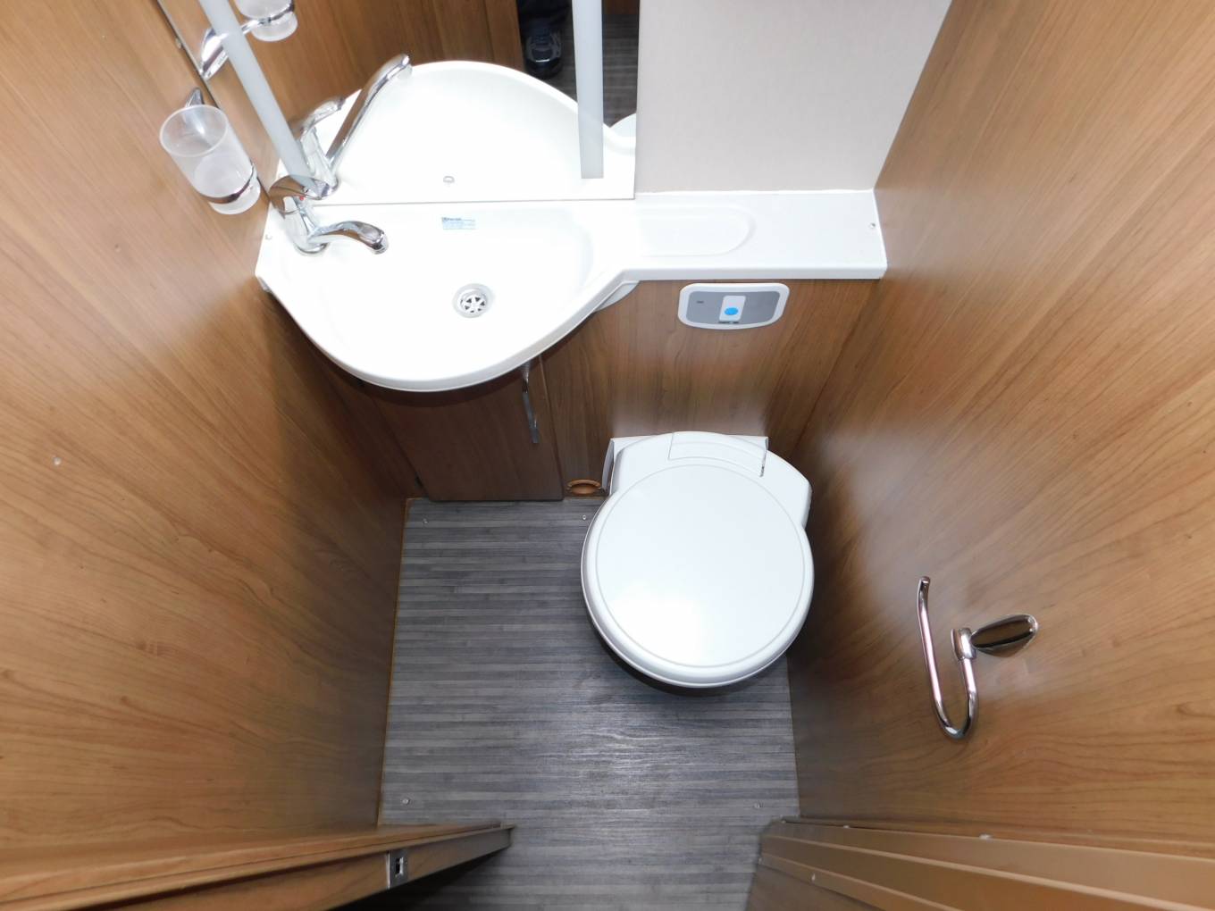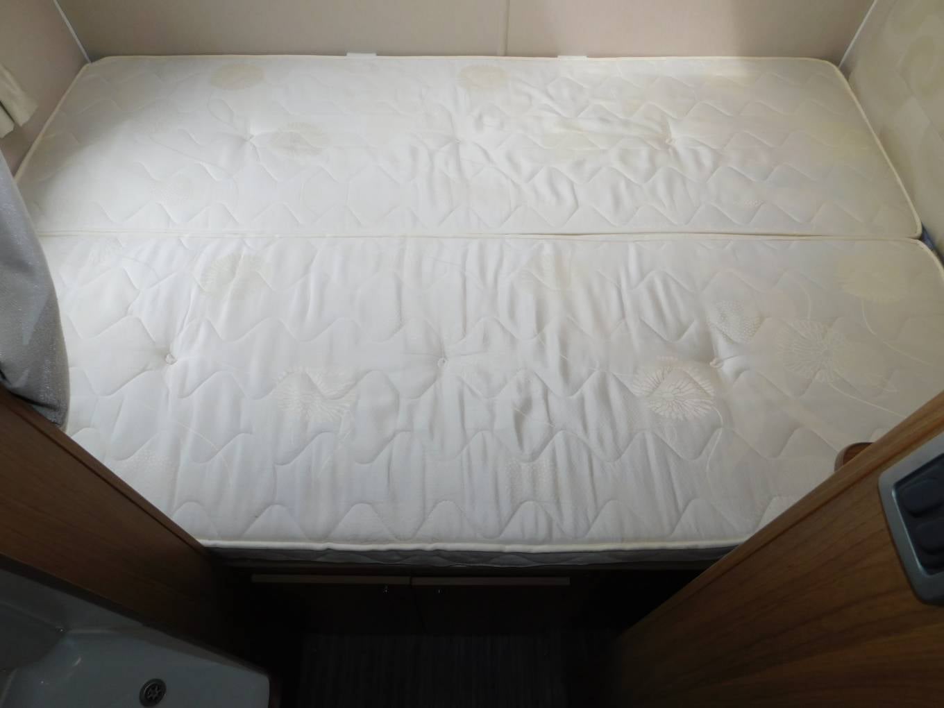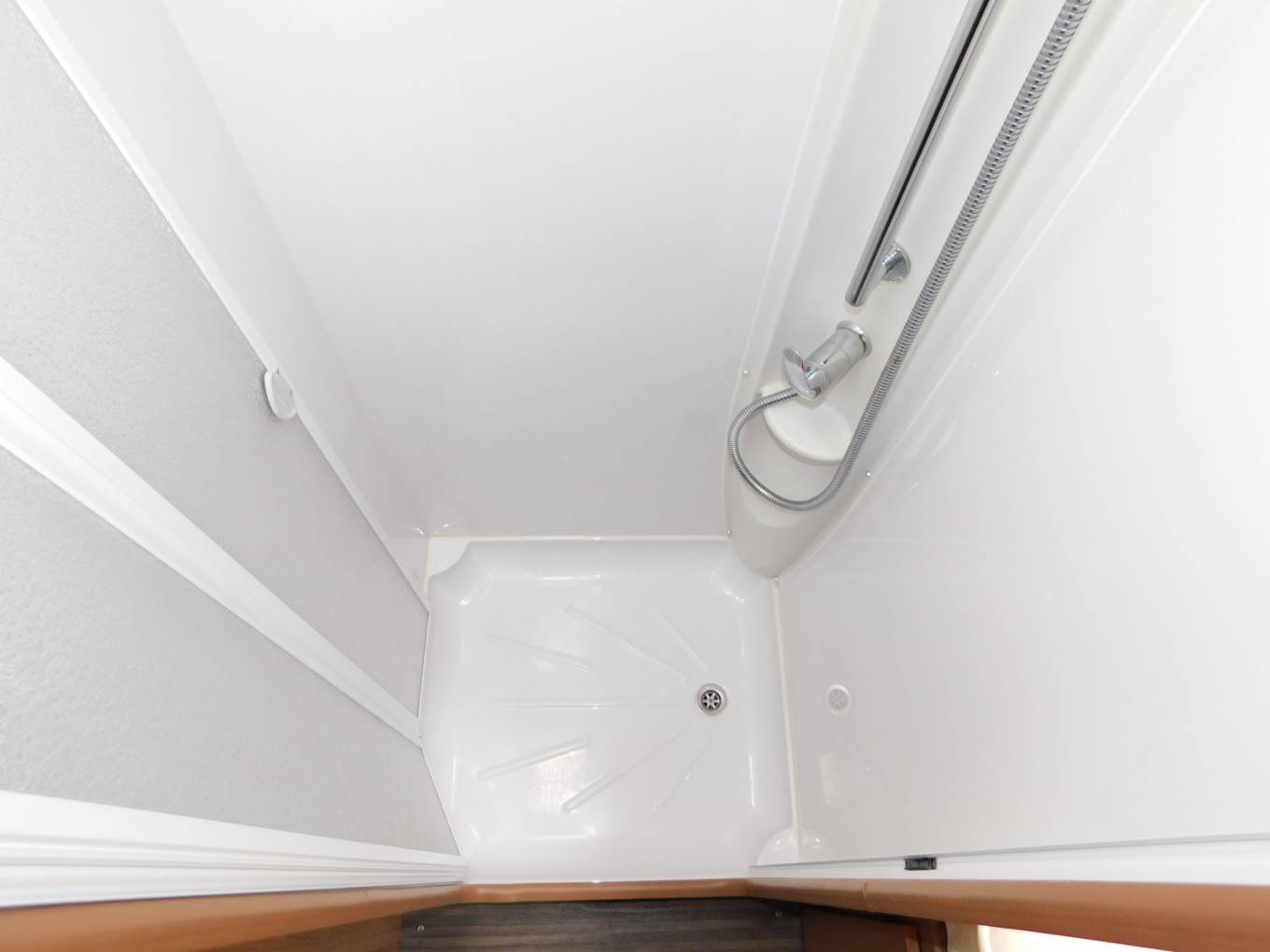 There is a large separate shower cubicle on the off-side with Perspex folding shower doors, on the opposite side of the van is the washroom with a built-in washbasin and chrome mixer tap, plus a Thetford cassette swivelling toilet with electric flush. There is a privacy door to section off the rear of the motorhome, plus privacy curtains to section off the bedroom from the washroom area.