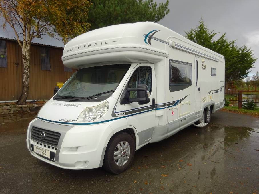 MotorhomeDepot.com Chester and Wirral present for sale this 2009 (09 reg) Autotrail Chieftain SE coach built motorhome that offers comfort and generous space for two. The layout is fixed rear bed over a large garage, central kitchen with huge worktop space loads of storage and a large fridge/ freezer. The lounge is just behind the driver and passenger seats. With a freestanding dining table the lounge becomes the dinette. The washroom facility comprises of a separate shower with Perspex door, the toilet and hand basin being on the opposite side of the motorhome. A nice feature of this layout is that the full door of the toilet closes to create a separate room containing the rear bed, shower and washroom. The kitchen and lounge diner then become another room. In the lounge-dining area there are long lounge seats on both sides with a freestanding table. A TV is included. This area can be used as two single beds or one large double bed. There are lots of storage lockers around the top. The kitchen features a full size oven with grill and dual fuel hob. The sink has a built in drainer and a choice of two covers to extend worktop space. A range of cupboards above and below the worktop copes with every storage need. Above the fridge freezer is a cupboard designed for TV and bracket. Next to the fridge is a Truma heater with a double door wardrobe above. Heating and hot water can be gas or electric from the Truma combi boiler. In addition there is a separate diesel heater nounted in the rear garage to make sure the van is a warm as you could want. There are fly screens and black out blinds on habitation windows. The upholstery is modern in design and in very good condition. This motorhome is very clean and tidy inside and out.