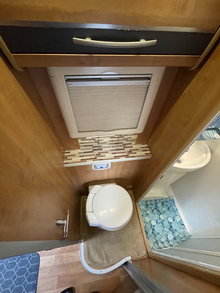 has a separate shower, wash hand basin, cassette toilet and a vanity mirror.