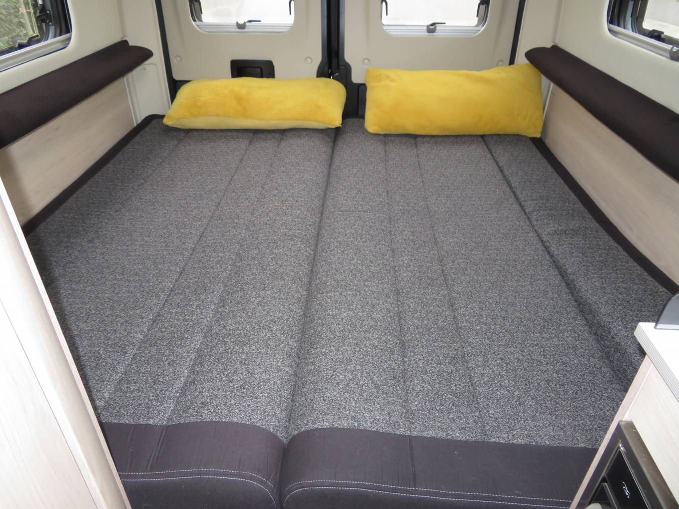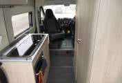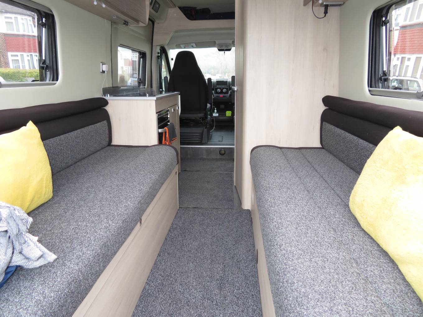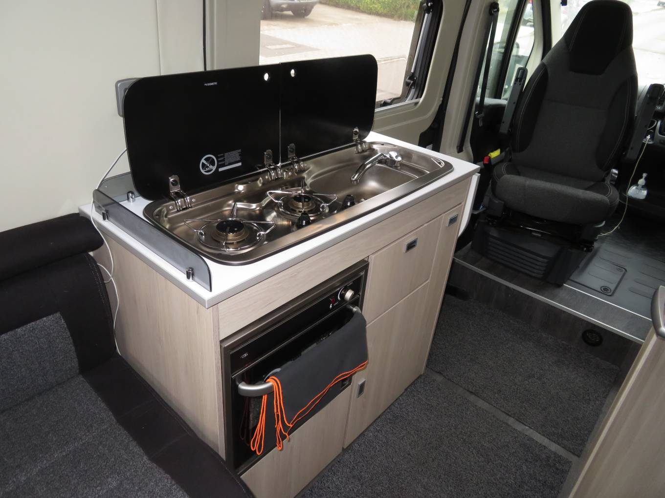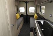 The living area is spacious and bright, yet still gives you everything you need. Starting from the rear of the van there is a rear lounge area made up of two side facing bench sofas. This is a great place to put you feet up and relax. There is also a table stored in one of the cupboards, that can be put up in the centre for an ideal place to enjoy and evening meal or snack. The Expedition comes with compact but well equipped kitchen which comprises of oven, grill, hob with 2 gas burners, stainless steel sink with tap and Dometic 3-way Fridge. At the front the two front seats swivel round - although the passenger seat opens out to the rest of the van.