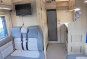 shower. Then there is the impressive central L shaped lounge with side couch with wall mounted TV and directly above the lounge area is the large electric drop down double bed and from the cab