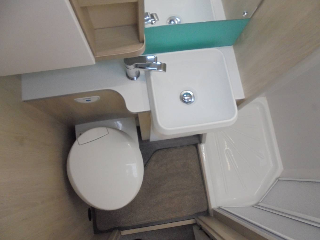 freezer, Bathroom with cassette toilet, modern hand basin and an all important separate