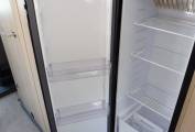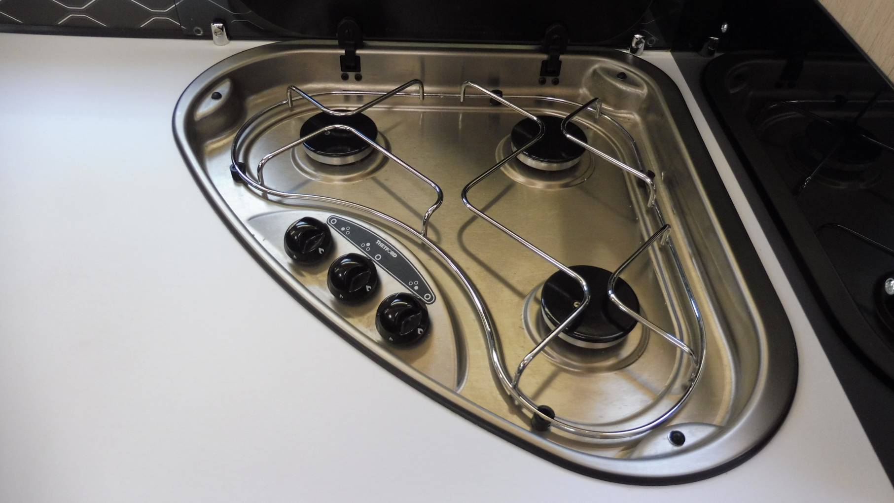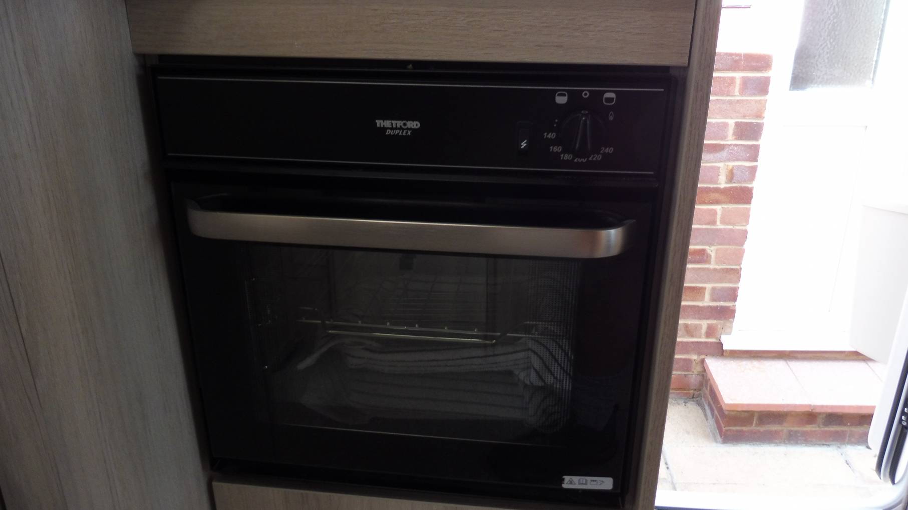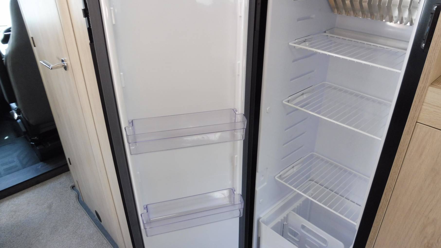 The kitchen is set up with 3-burner hob, combination oven and tall fridge with large freezer compartment. Opposite which is a large washroom with vanity sink unit, cassette toilet and an enclosed shower cubicle.