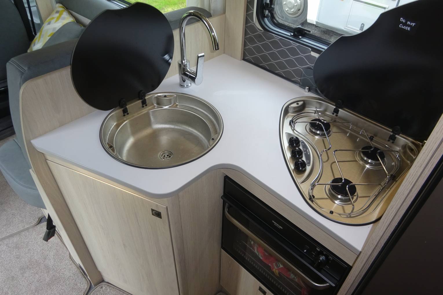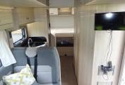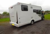 The outside of the motorhome is in excellent condition. As you step inside the motorhome you get a feel for the newness of this motorhome. It is light and airy and in excellent condition. At the front of the motorhome you find a large seating area that benefits from two captains chairs to supplement the settees and has a large movable table. It is fitted out with a truma habitation air con unit for those hot summer days. It has a well equipped kitchen with a large fridge, sink, 3 burner gas hob, oven and grill, and microwave. Opposite the kitchenette you find the bathroom fitted out with a toilet, sink and separate shower cubicle all in excellent condition. At the rear of the motorhome you find a large double bed that can be used as a double or two singles. With another large drop down double bed over the lounge area, and the settees make up in to another double it easily sleeps 4 and comfortably sleeps 6. There is plenty of storage throughout the motorhome and benefits from a large rear garage that could comfortably hold anything you may wish to take with you!