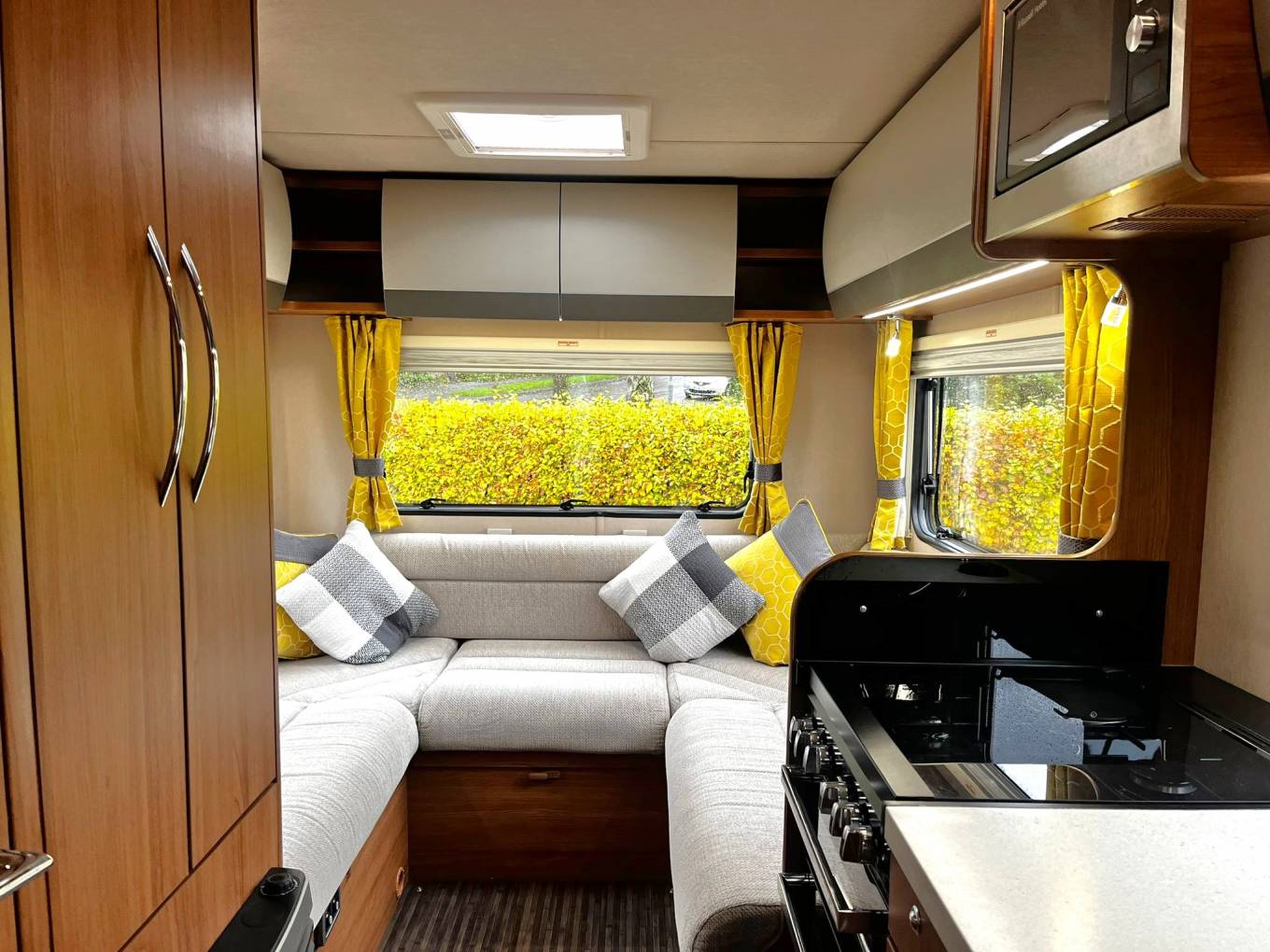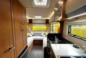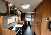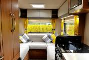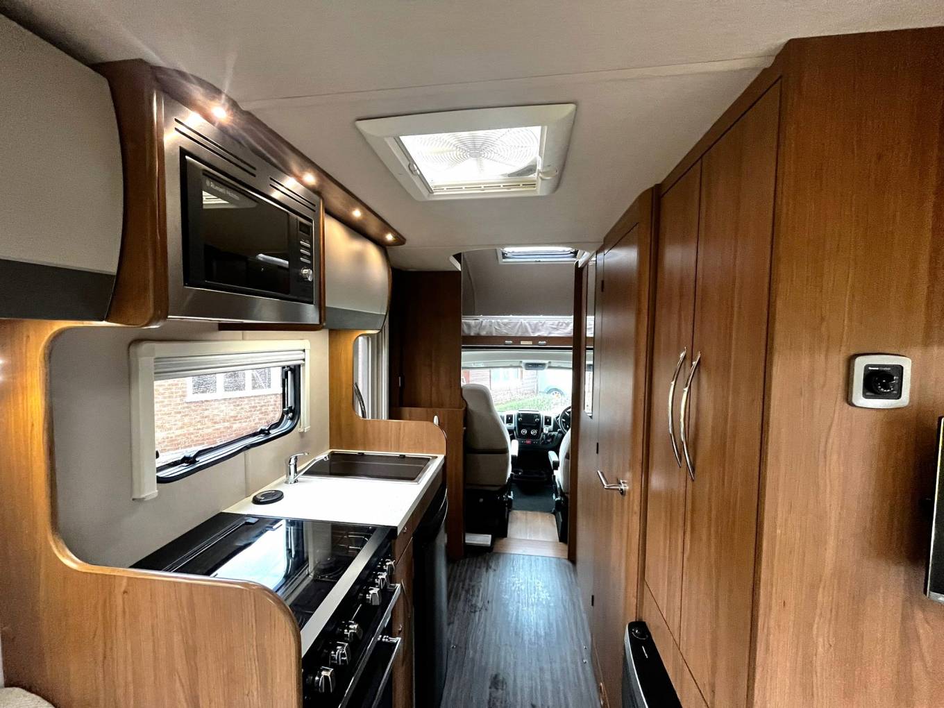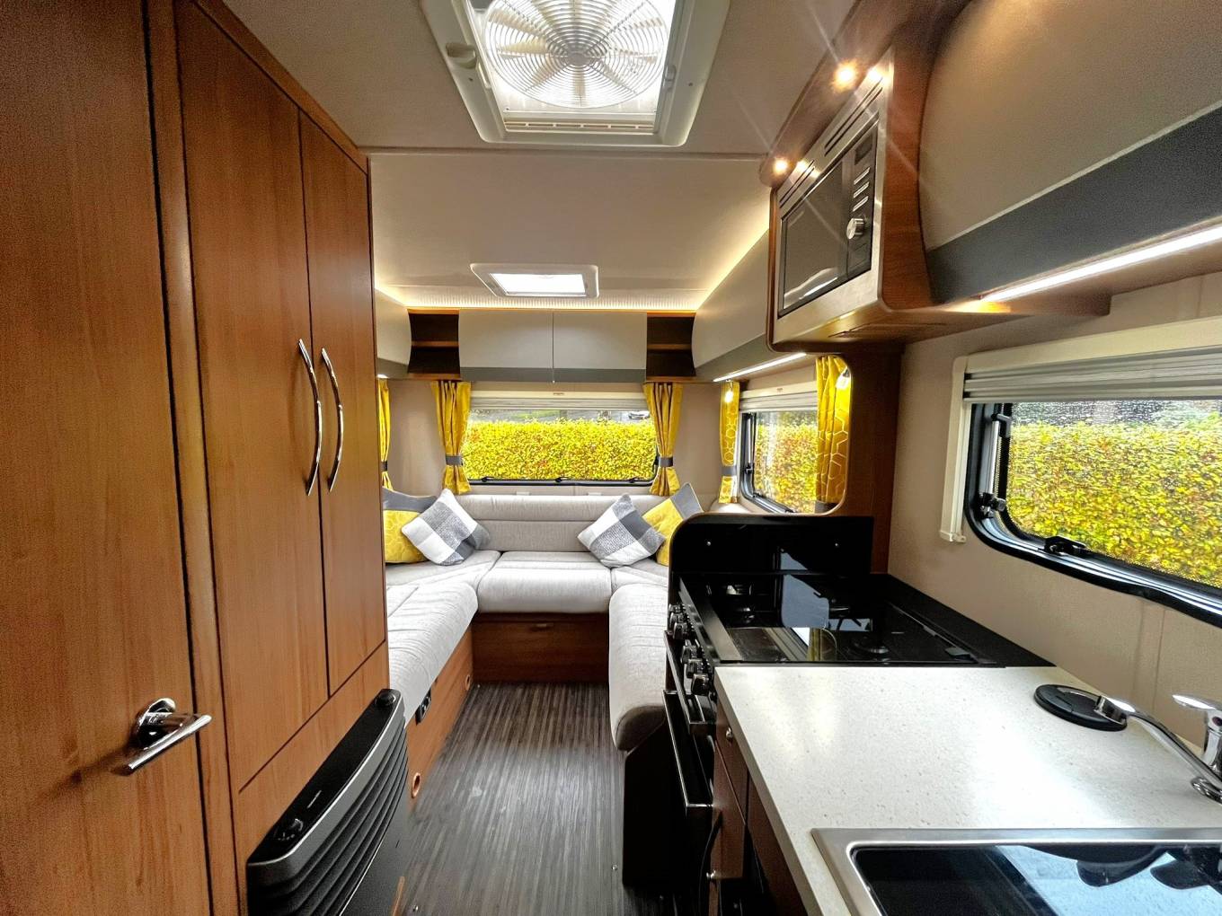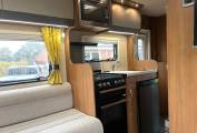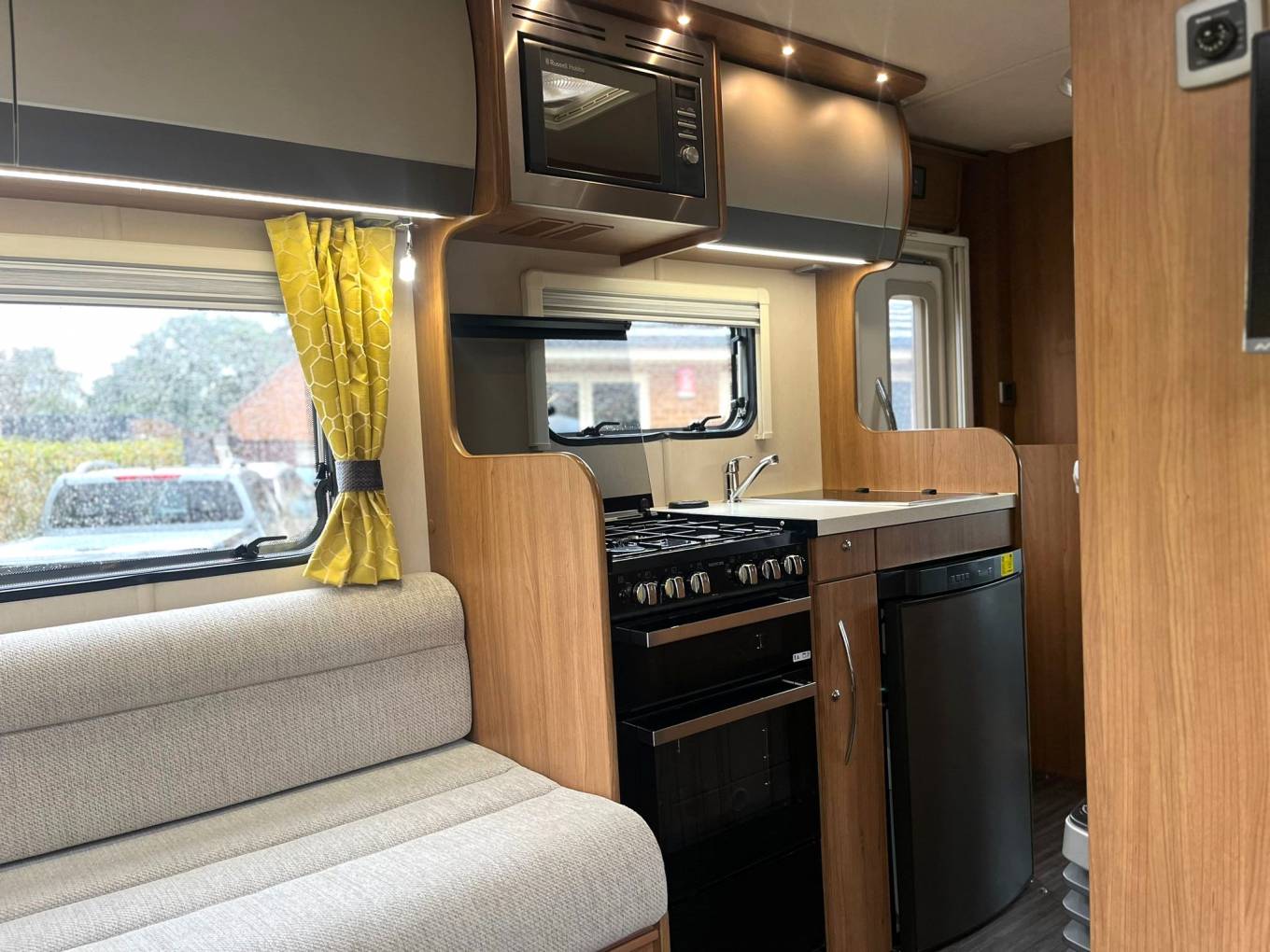 Stepping inside the Imala using the habitation door you entre at the central kitchen area this comes fully equipped included is a stainless steek sink with mixer tap, Thetford cooker with separate oven and grill, 3 burner gas hob with an electric hotplate, Russel Hobbs microwave Dometic 8 series fridge with freezer icebox and ample storage space.