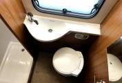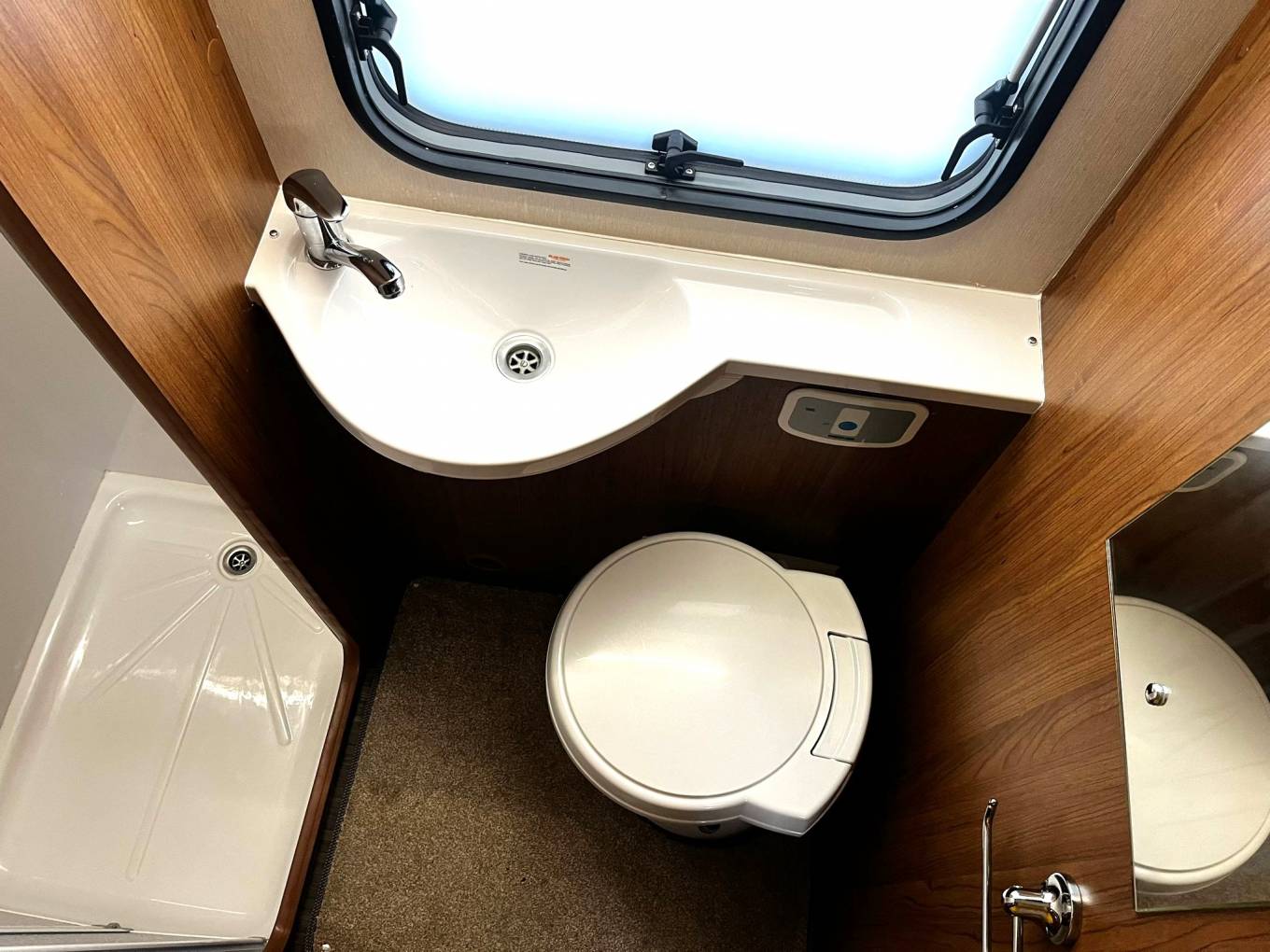 The washroom sits adjacent from the kitchen houses the separate shower, vanity unit with sink and toilet cassette with 12v flush.