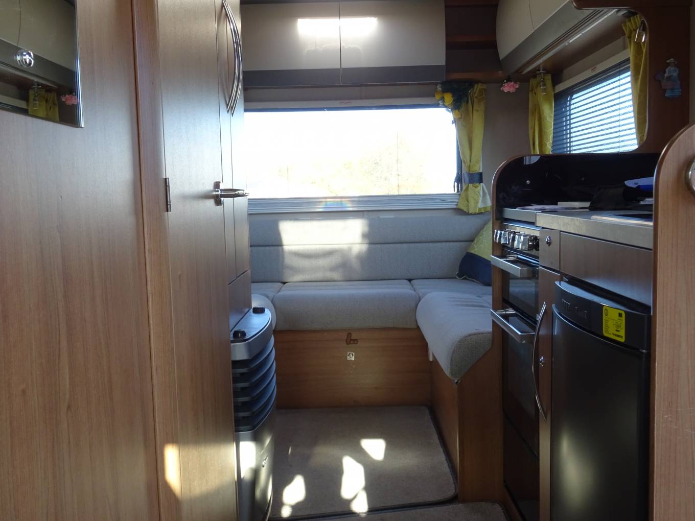 Going into the kitchen, there is all you would expect - a separate oven and grill, microwave, fridge with ice box, 4 burner hob (one electric) and a pop up plug. There is also a sink with hot/cold water and plenty of work surface with storage below and above. Opposite is the washroom, consisting of a separate shower, cassette toilet, sink and bathroom cabinet.