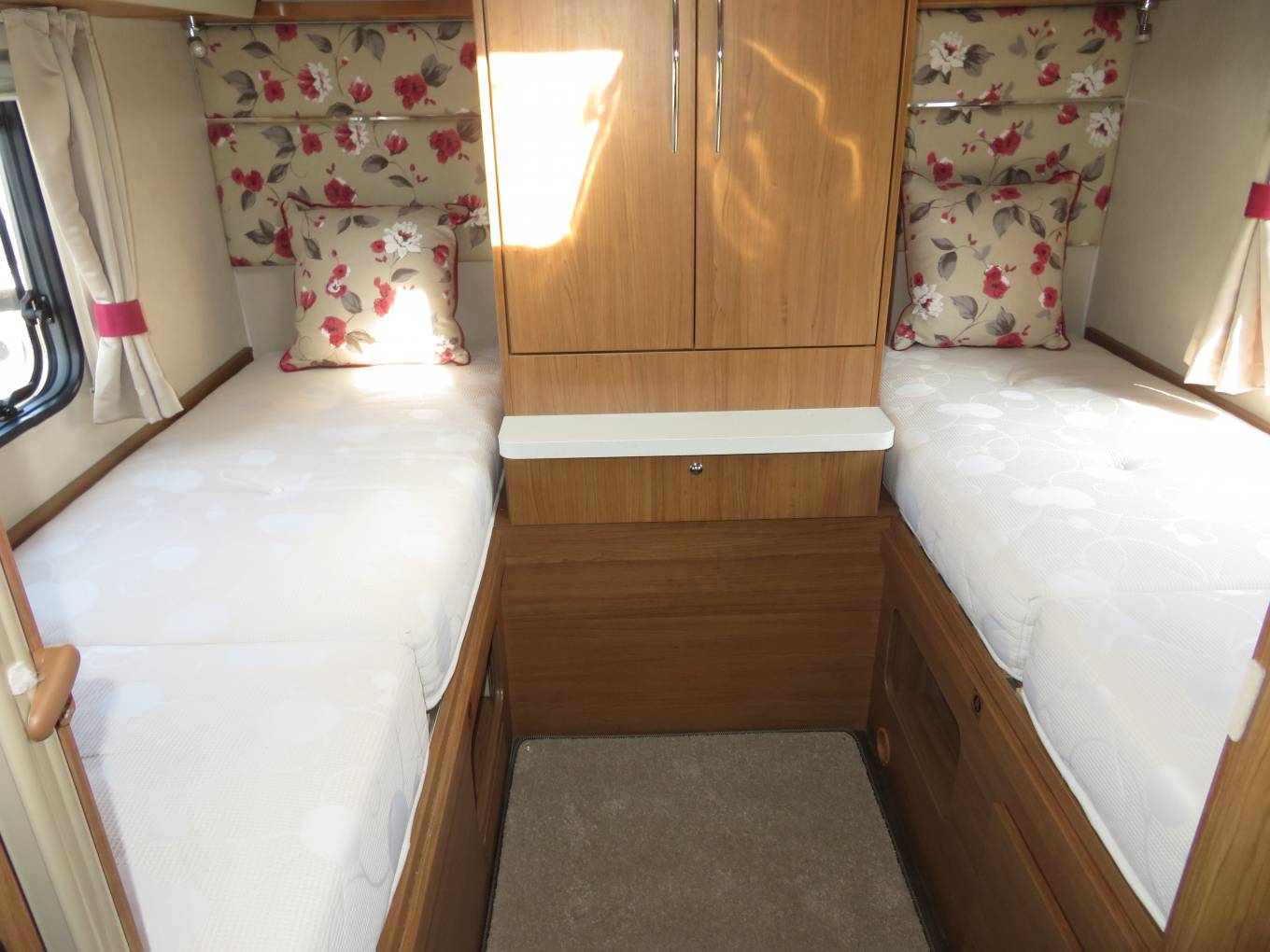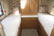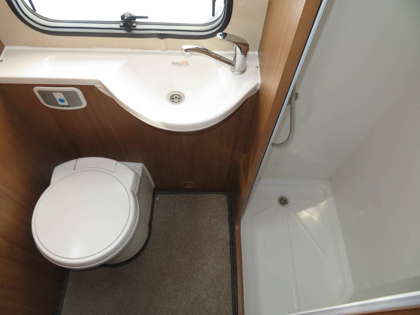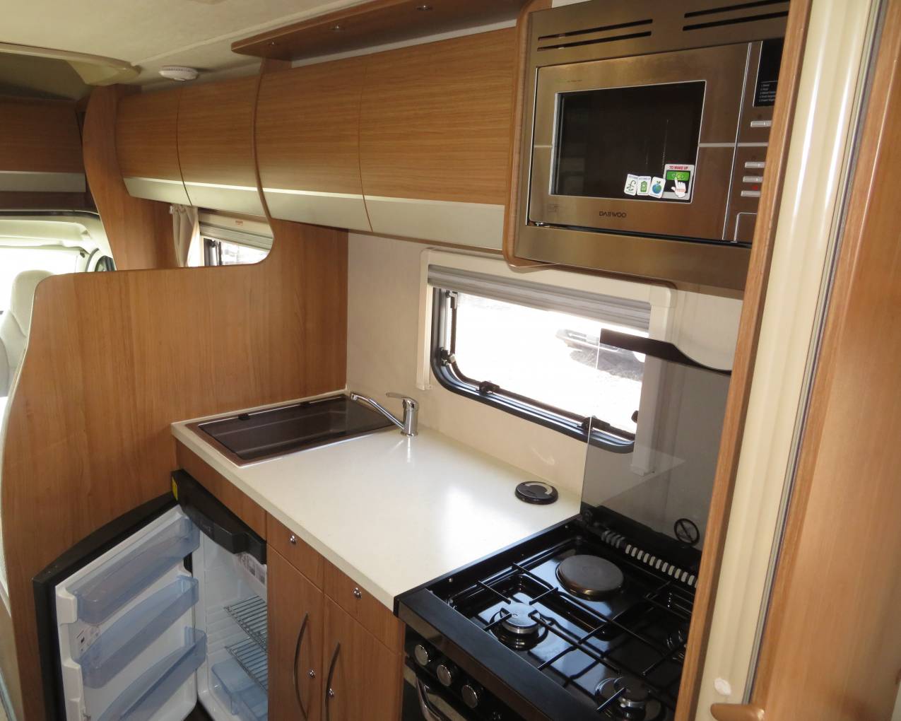 The habitation area is in good condition. At the front you have a front facing double sofa, a further single side sofa and the front seats that rotate. There is also an extending dinette table which gives you have the perfect place to relax or to enjoy a drink, snack or a more substantial meal. There is also a pull down television should you find time to watch this on your holidays. Moving back, the motorhome has an extremely well equipped kitchen featuring an oven, grill, hob with 3 gas burners and an electric hotplate, microwave, sink and fridge with ice compartment. The work top features a useful pop up socket tower for additional appliances.At the rear of the motorhome you have an extremely spacious bedroom area featuring two fixed single beds and central wardrobe. This motorhome also comes with a generous washroom featuring cassette flush toilet, sink and the all important separate shower. Heating and hot water is provided by the simple to use Truma Inet system.