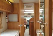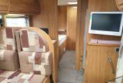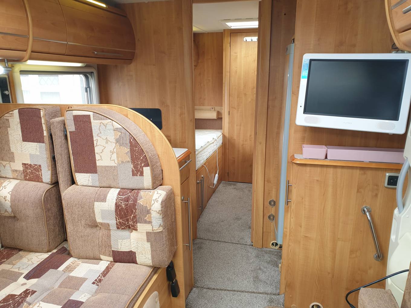 by a Truma blown air and boiler system. An Avtex TV is mounted on a bracket near the