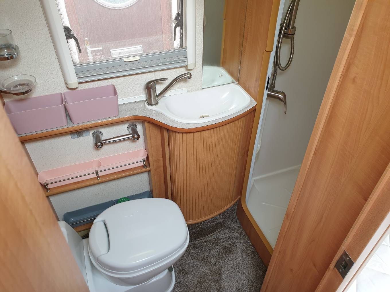 van we have the washroom with Thetford C-250 toilet, separate shower cubicle, a