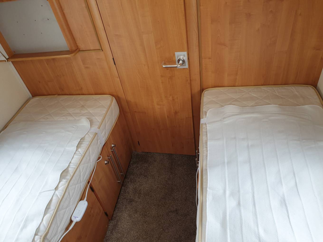 and loads of storage. In the bedroom we have two fixed single beds with good