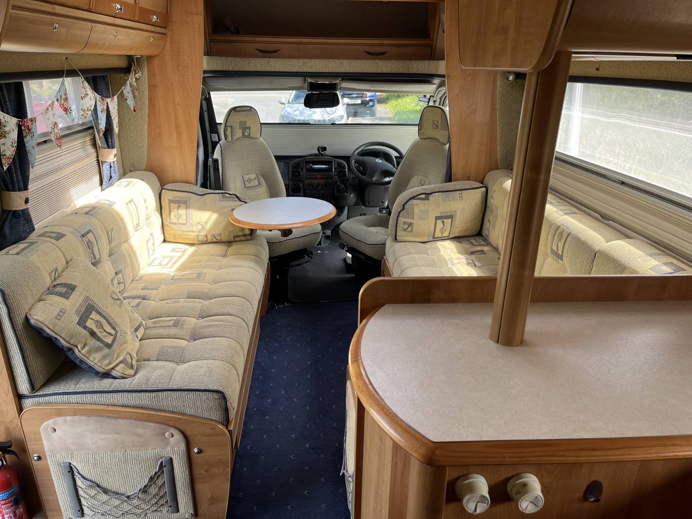 immediately on your left with a handy swing-out coffee table. Both the cab seats swivel and coupled with