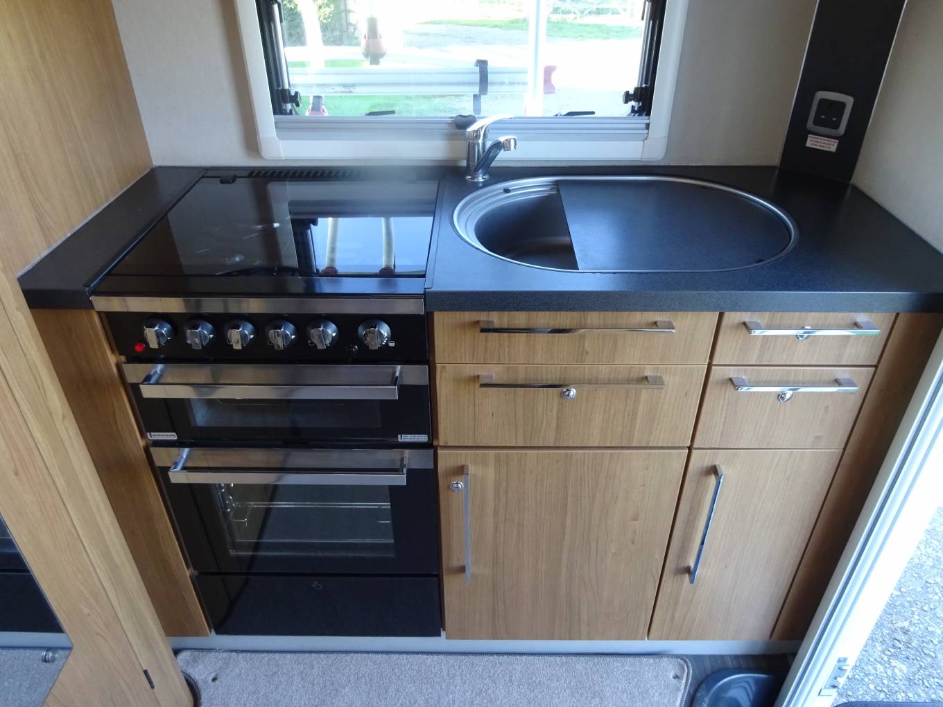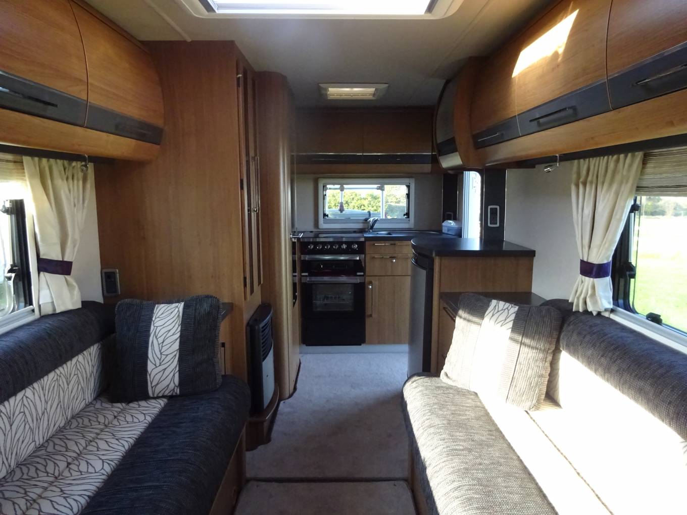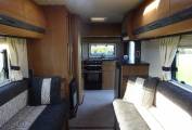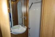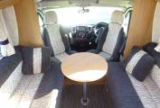 At the rear of the Navajo we have a really well designed kitchen featuring a full oven with separate grill, integrated microwave, three ring gas hob with one electric hot plate, fridge freezer and stainless steel sink with mixer tap and drainer. There are storage options throughout the vehicle with overhead lockers, wardrobe and under seat space.