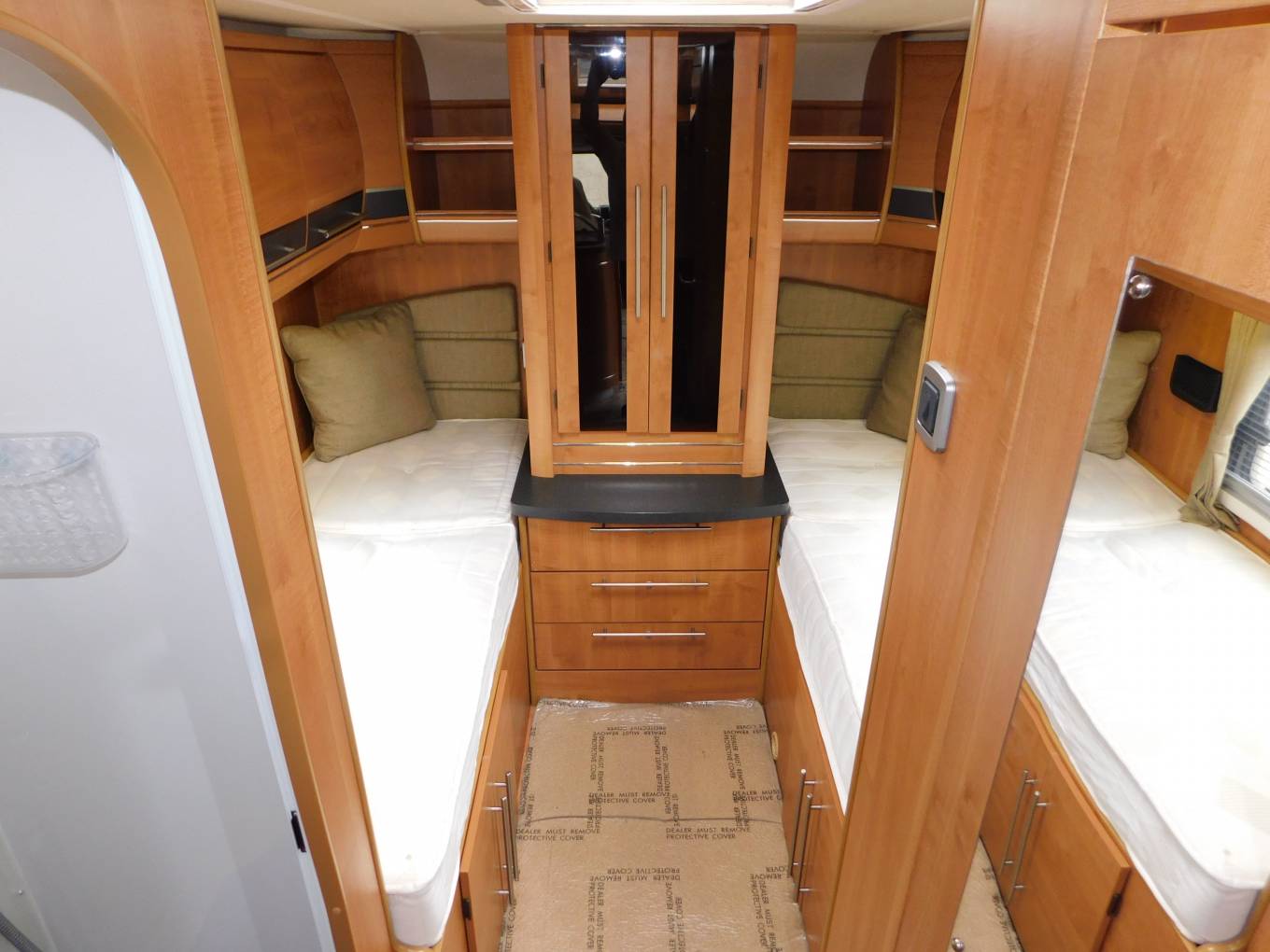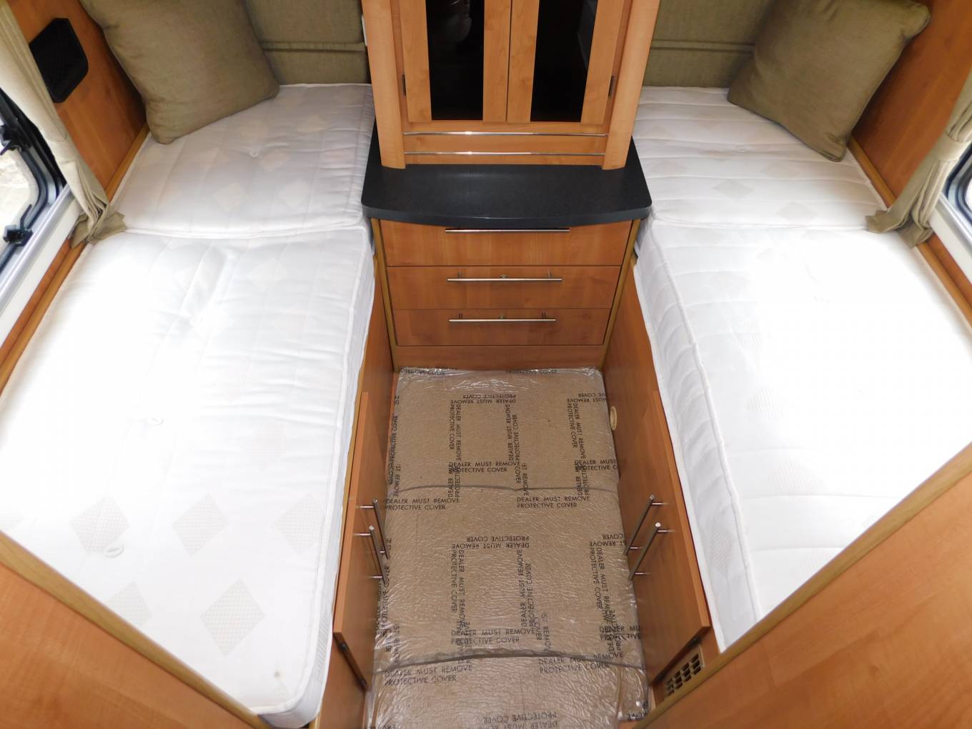 - The main feature of this luxurious motorhome is the rear bedroom, with luxurious twin fixed single beds each side, so no more climbing over each other to get in or out of bed. In between the beds is a double door wardrobe with hanging rail and storage drawers beneath, plus upper aircraft style lockers and under bed storage available.