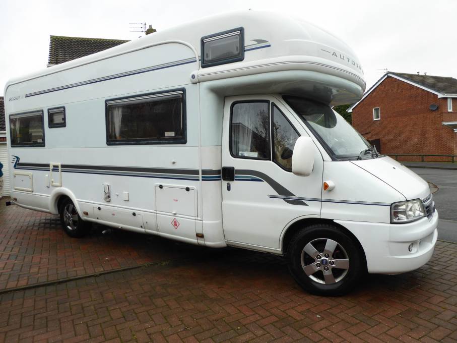 Call with any questions on 01423 609985. This is an Autotrail Scout SE that is all set up for extended trips into Europe, it’s all ready to go. It was first registered in May 2004 has the every impressive 2800cc Fiat engine and with only 3 former owners has travelled 62574 miles. This coachbuilt motorhome sits on a AL-KO chassis, has a 5-speed manual gearbox and measures 7.33m in length. The list of extras is impressive and will set anyone up for an extended stay where they happen to be. Externally it has a tow bar with an attachment which provides an alarm for when chaining up bicycles, there are 3 external lockers at the rear that can be accessed from either side to create additional storage down each side of approximately 4ft 12inches x 2ft 3inches and then full width at the rear. Also in this area you will find plenty of 240v 13amp sockets available and extra storage below floor level. It has a satellite system and WIFI booster system externally too. Internally at the rear you will find the large lounge which can be used as 2 single beds or as 1 double bed. The washroom includes a toilet, sink and shower with full enclosed cubicle to prevent the washroom from water ingress. As you go into the kitchen this area includes a cooker, oven, grill, 3 gas burners, 1 electric hob, sink and fridge freezer. The kitchen is opposite the dinette which also converts into a double bed and is fitted with 2 full forward facing seatbelts. Upfront there is a radio/ CD player with a DAB controller, a reversing camera which not only works in reverse gear, but it can also be used a security aid and operated remotely without the engine running. It also benefits from 3 solar panels, 2x 100 watts 1x 150 watts, i2 controllers and 2 leisure batteries. A good feature often overlooked is that the blinds all work perfectly, they are very easily pulled up and easy to pull back down. The owner has fitted an extra fridge cooling fan which ideal for hot weather. Included in the sale is the TV, DVD player and full length vehicle cover that was from the owners previous motorhome. It has an excellent service history with only 2011 service missing. This is an excellent vehicle, well maintained and cherished, well suited to people looking to spend extended periods of time away. In can be viewed in Hartlepool, Cleveland. Part Exchanges welcomed on this vehicle, for further information and photos please call us on 01423 609985 quoting reference 46993