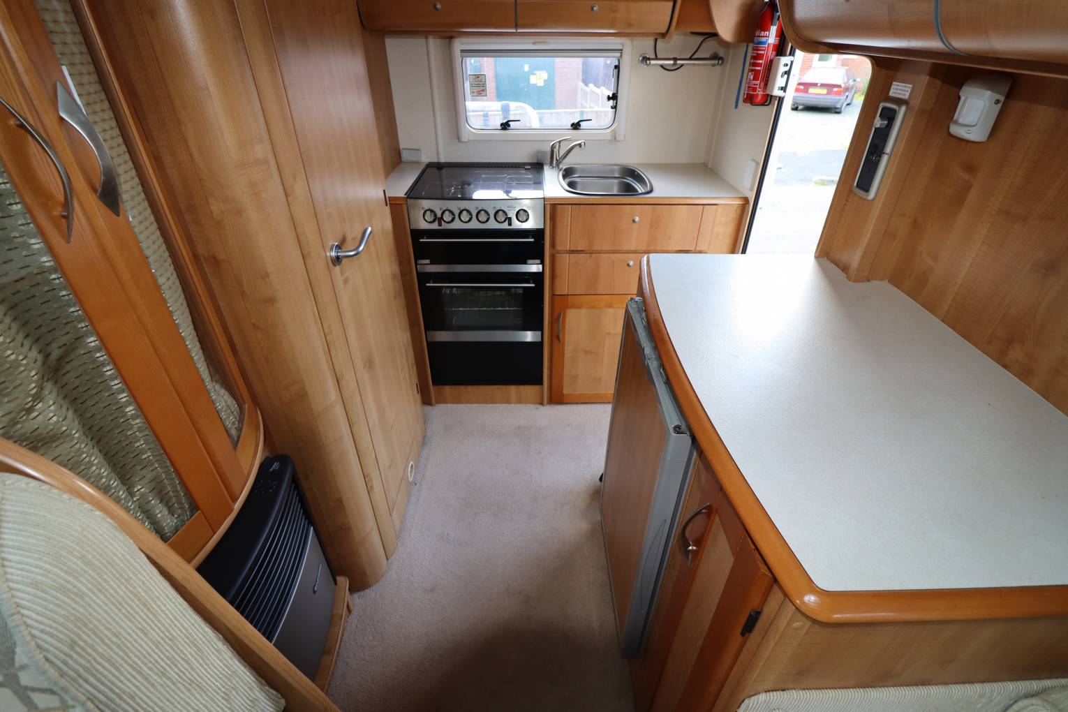 A lovely presented compact motorhome with 4 travelling seats. The kitchen is at the rear of the motorhome, fully equipped with fridge, hob, cooker, sink, microwave, grill and oven. The washroom is adjacent with shower, toilet and sink. The Lounge area is spacious, an L shaped settee has 2 additional belted seats. This area makes into a small double, the single settee can be pulled across making a large double. Further sleeping is above the cab area, this can also be used as storage. Extras include - Bike Rack; Solar Panel; Cab air conditioning; Awning; Reversing Camera and sensors. New MOT has just been done.