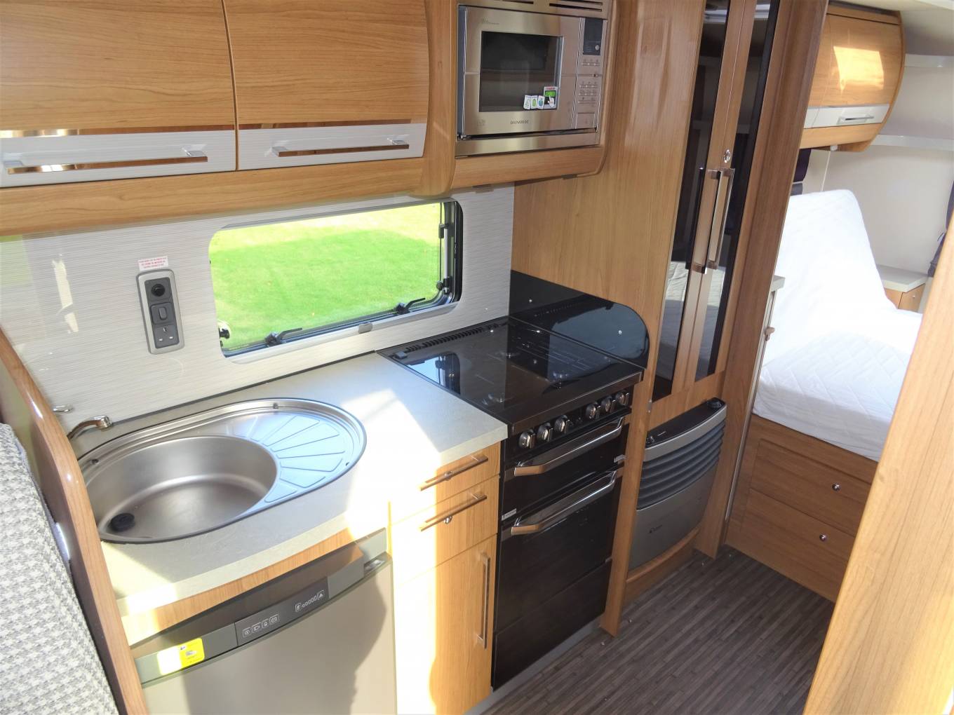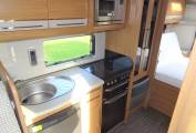 Carrying on through, you come to the kitchen which has everything you need to rustle up a lovely meal. There is a 4 gas ring burner hob, a oven with grill, a large Dometic 3 way fridge freezer, a sink with mixer tap, a microwave and lots of storage space for utensils and ingredients plus a good work top area.