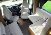 Moving towards the front of the motorhome is the incredibly spacious central dinette and is flooded with light making it a fabulous spot to relax and unwind in. There is a forward facing 2 seater sofa and a rear facing 2 seater sofa fitted with a further 2 seatbelts along with a large dining table in between. Opposite this is a large side facing sofa so if you have guests there is certainly no shortage of seating options. These both side out and rearrange together to make the second double bed.