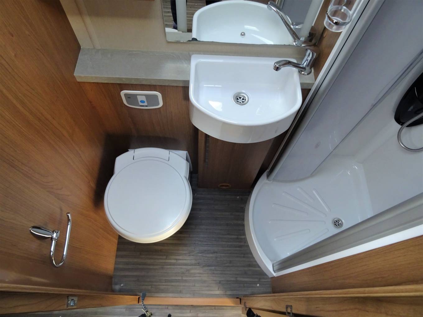 As we move through the motorhome, you have the well sort after large washroom which consists of a separate shower, Toilet, washbasin and storage cupboards and shelves with a good sized mirror.