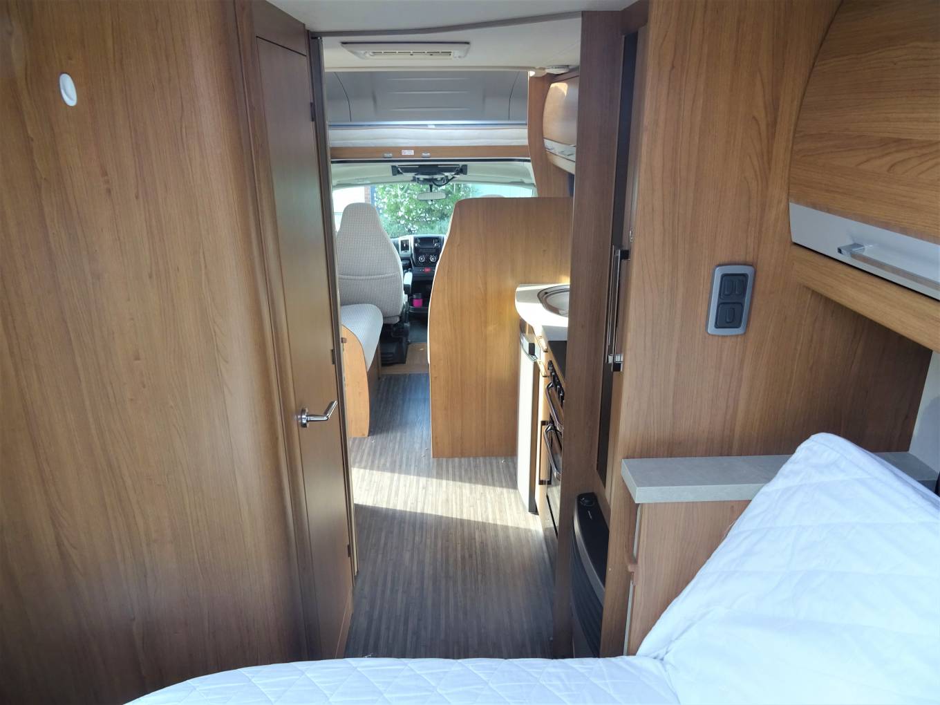Above the cab is a huge double bed with plenty of room for 2 tall adults. Below in the cab, the vehicle has a manual 6 speed gearbox, a state of the art touchscreen interface which includes radio, Sat Nav, bluetooth phone and reversing camera. There are also electric windows and mirrors. Externally there is a wind out awning to allow al fresco dining as well as a very good sized rear garage.
