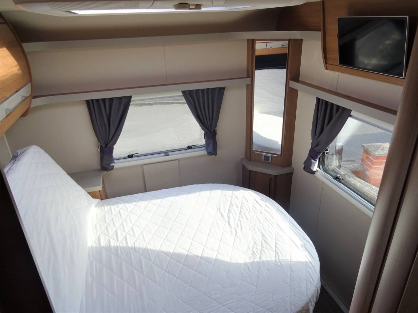 Starting with the rear of the motorhome where you have the master bedroom which includes the popular island bed which can be positioned in an upright position to make it easier and more comfortable to watch the wall mounted TV. Also in this room is plenty of storage from the overhead cabinets as well as drawers either side of the bed. In the roof is a large skylight which along with the windows flood the room with natural light.