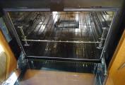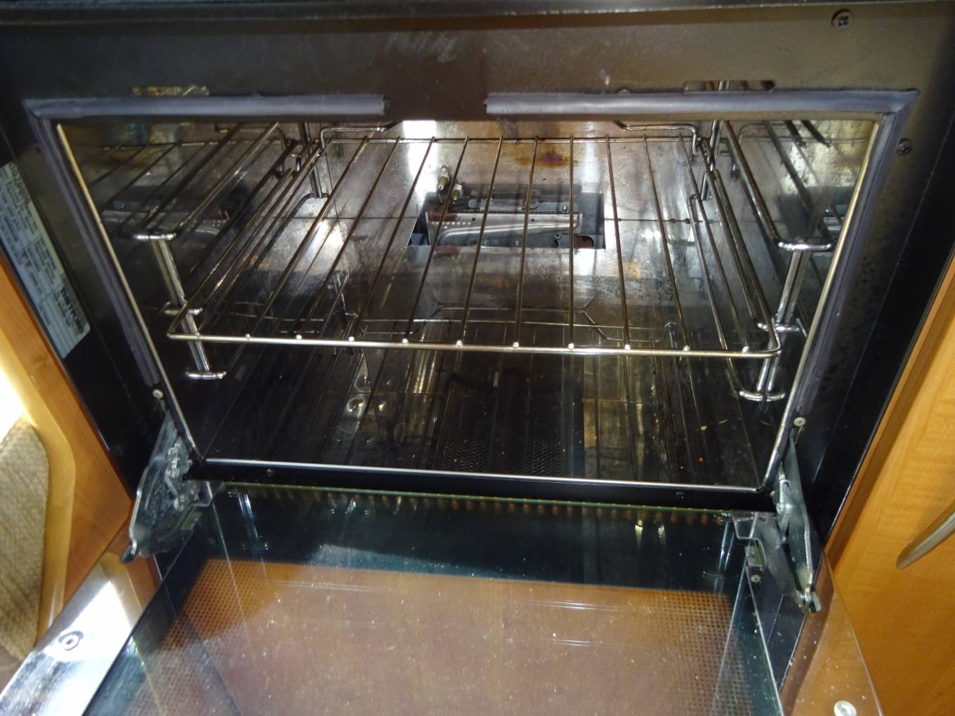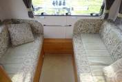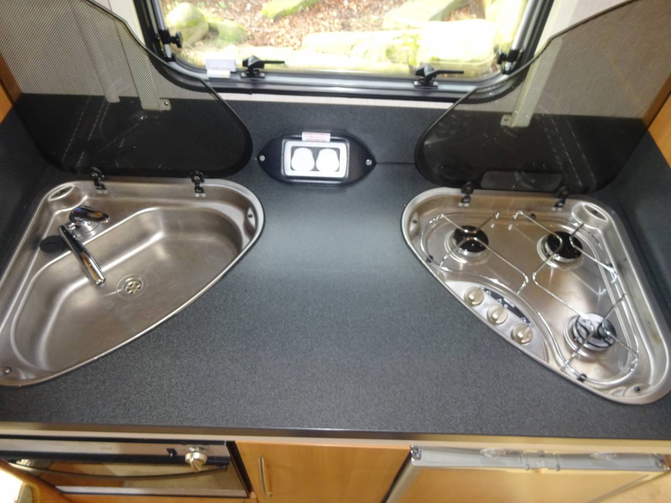 The nearside kitchen galley, is well proportioned and specified. Three gas burners, a combination oven and grill for cooking and food preparation, 3 way fridge with small freezer compartment and sink with recently fitted new taps.