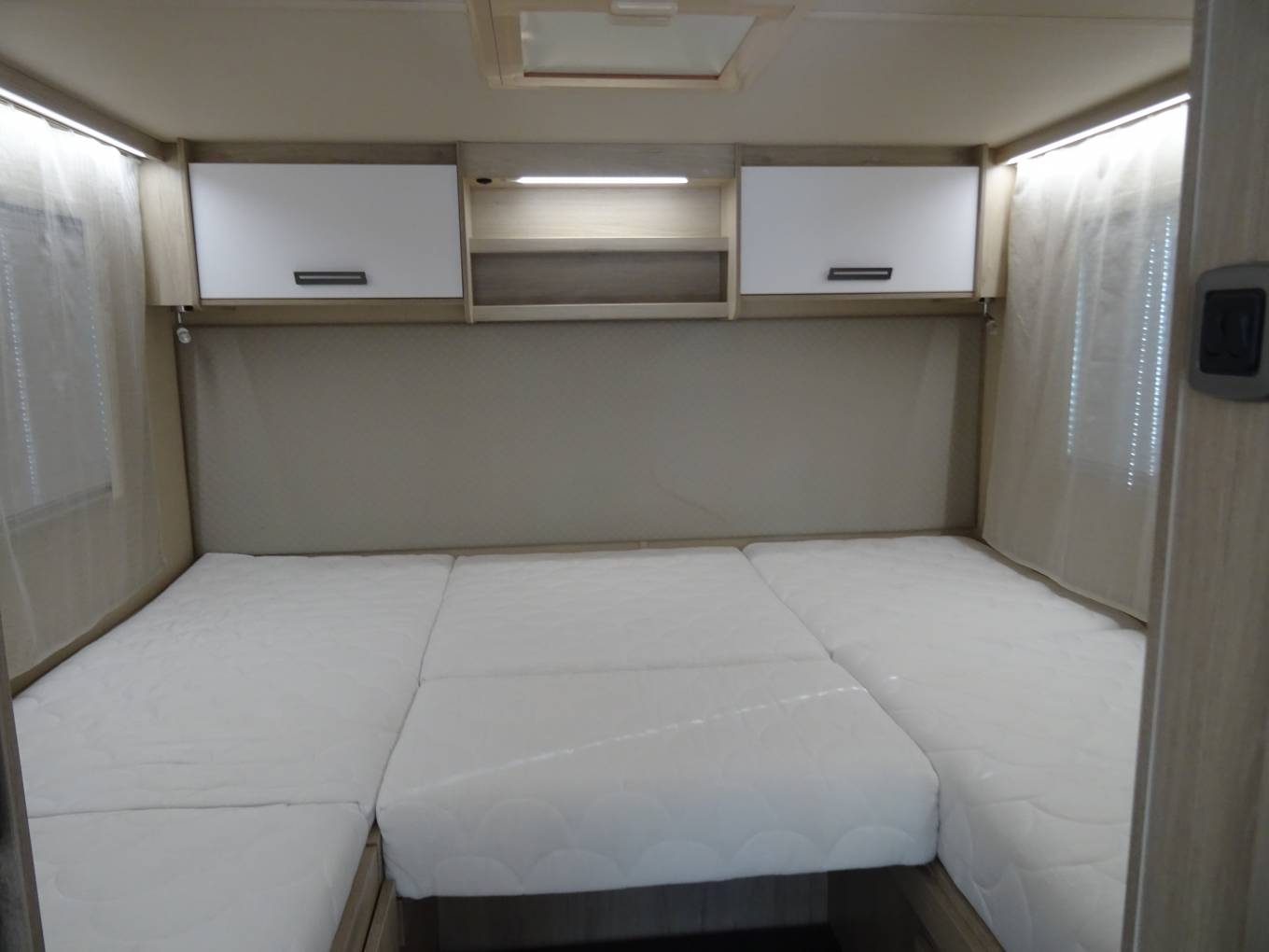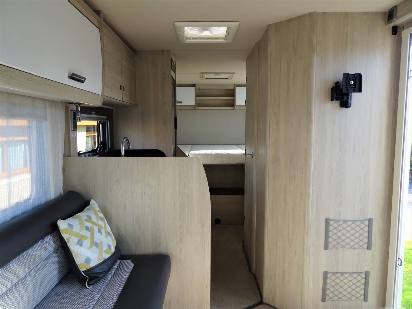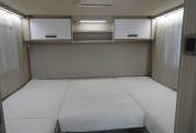 The MH has fixed double bed that provides a sumptuous raised rear sleeping space (it can be 2 single beds if needed) over a garage space that is accessible externally from both sides and there is also wardrobe storage to the foot of these fixed beds