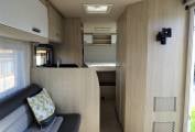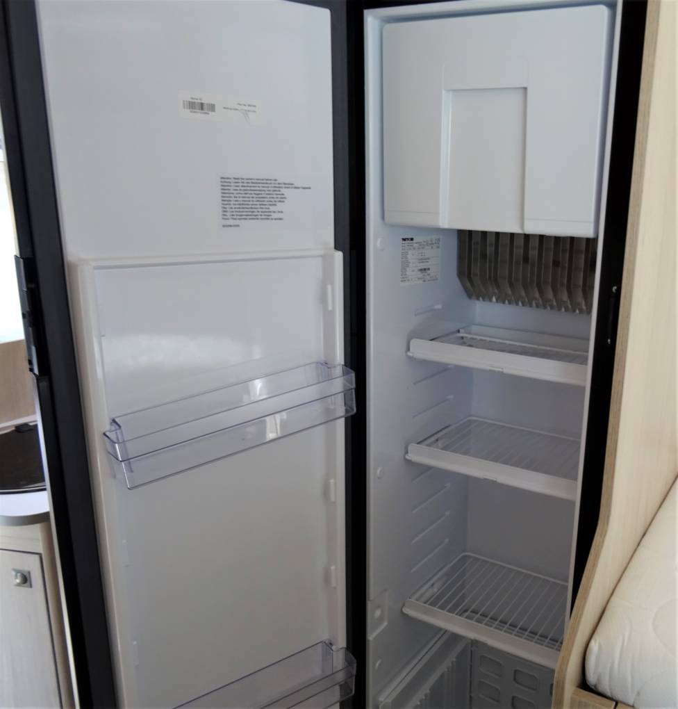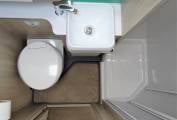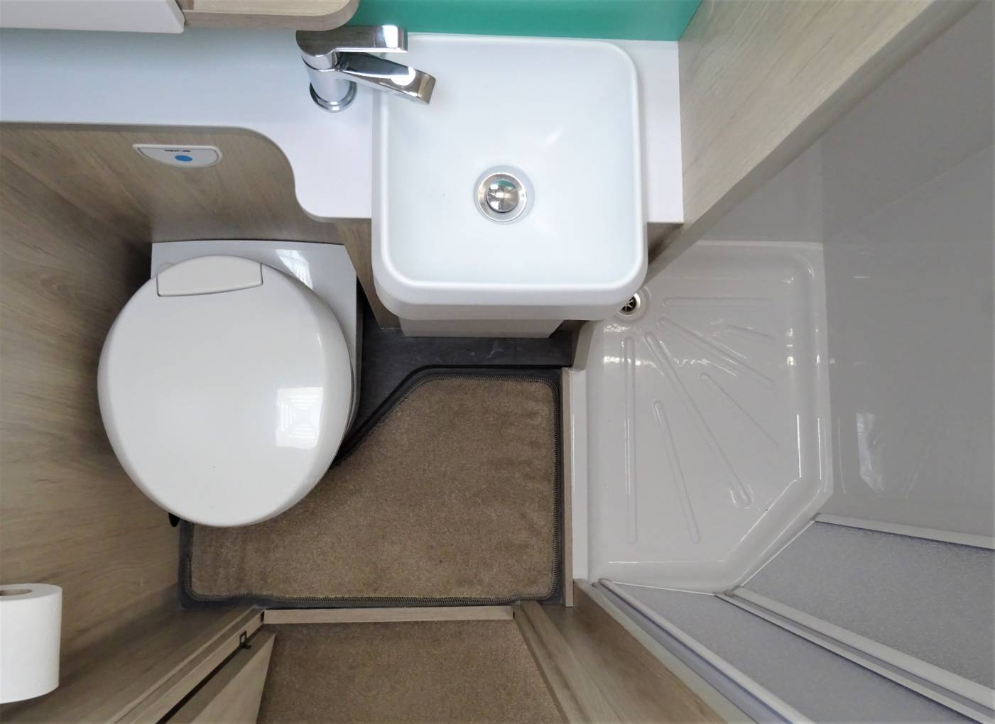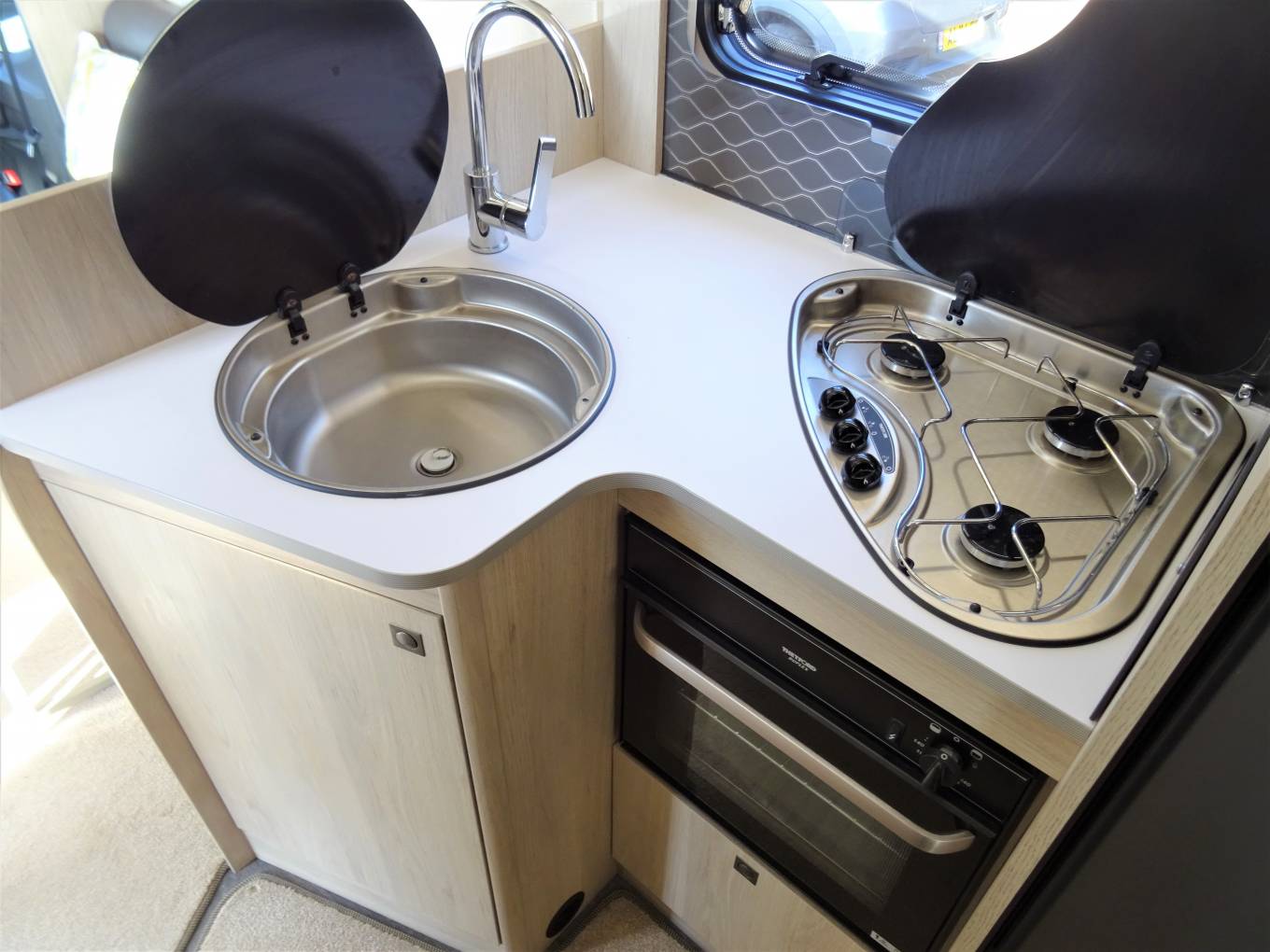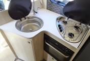 Midship you will find your offside kitchen, fully equipped and modern with; 3-gas hob, combination oven/grill, sink with hot and cold running water from the Whale system and a full size slimline fridge freezer alongside. The spacious modern washroom has a separate enclosed shower, sink/vanity storage and a toilet with removable toilet cassette.