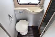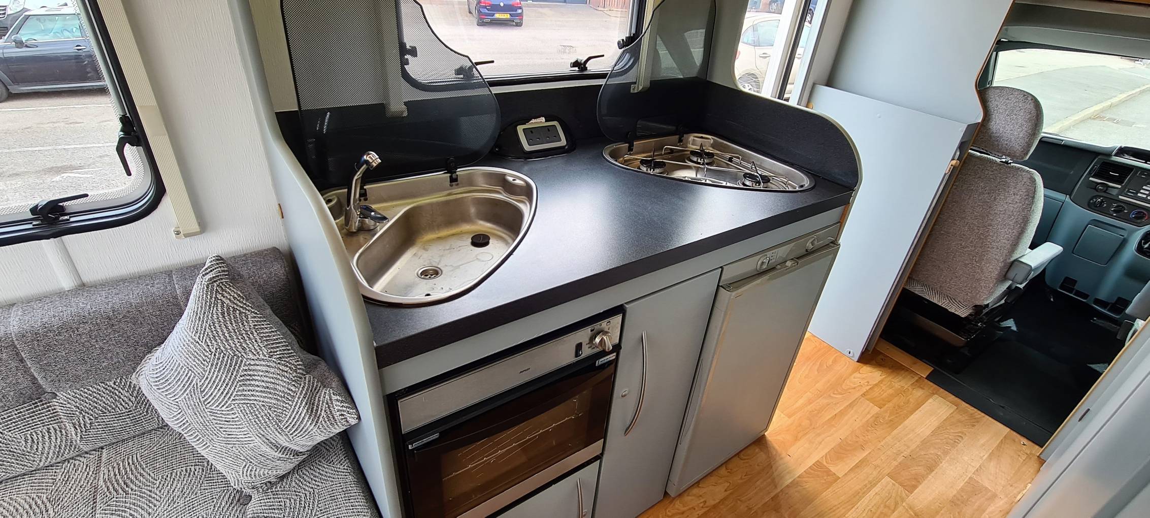 The kitchen is equipped with a 3 way fridge, 3 gas rings, sink with mixer tap, oven and grill and lots of storage around.