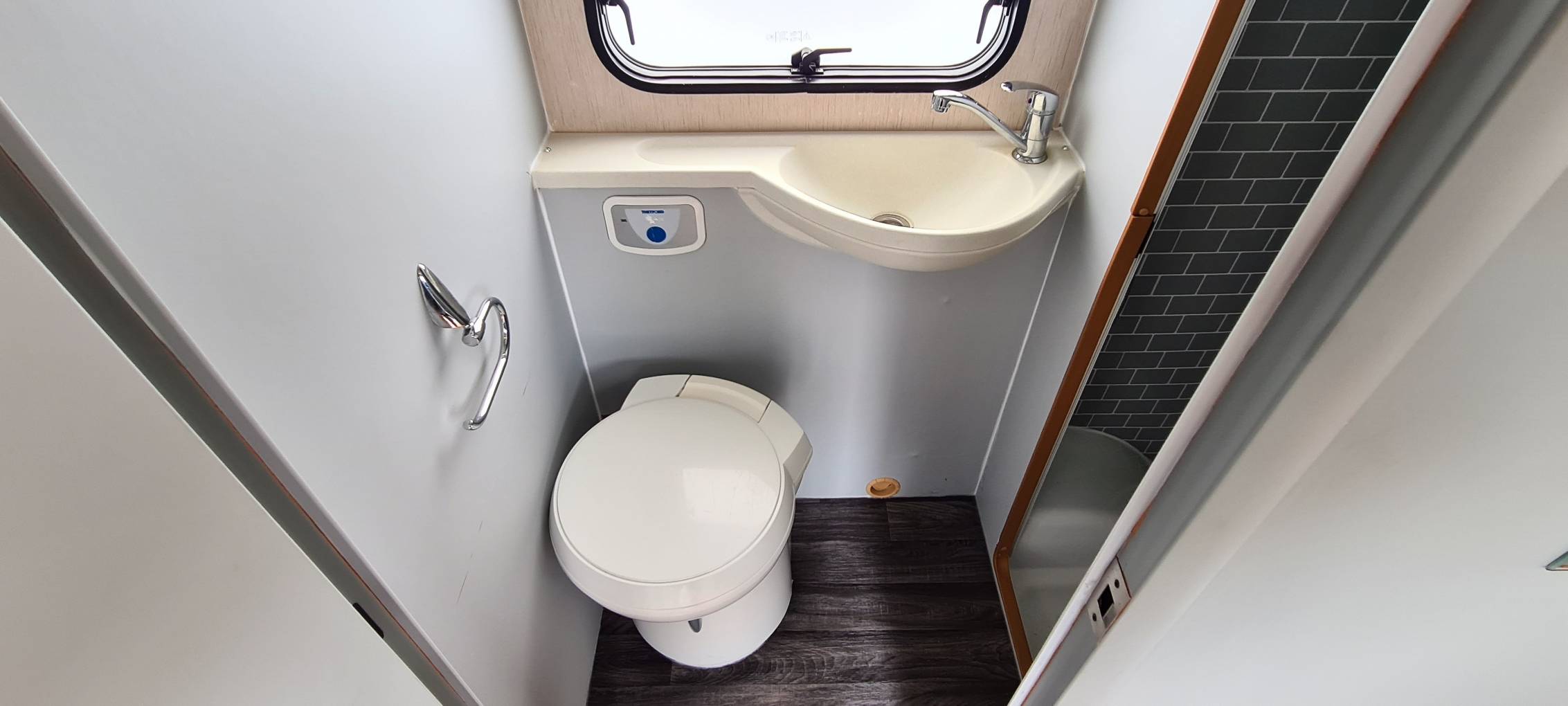 The washroom has an electric flush toilet, a separate shower which has also seen moderations being completed in a grey tile look.