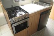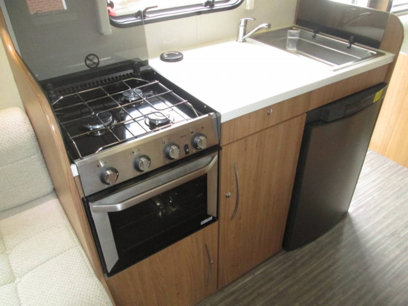 There is a Modern Style Kitchen Area with Full Oven, Hob, Grill, Sink, Three Way Fridge Freezer plus Work Space