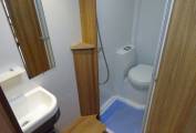 Washroom with shower cubicle and toilet with a separate vanity area.