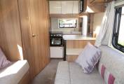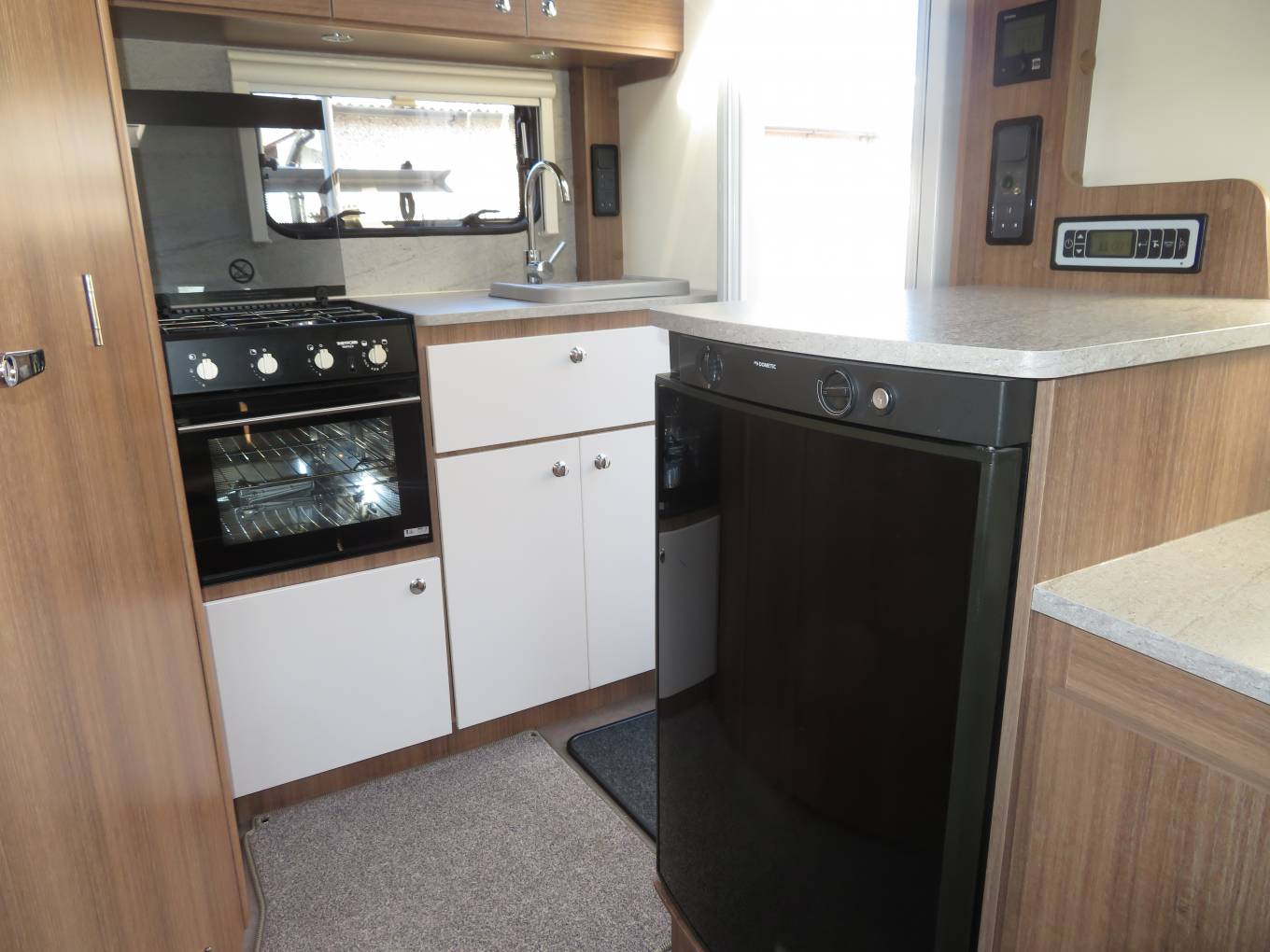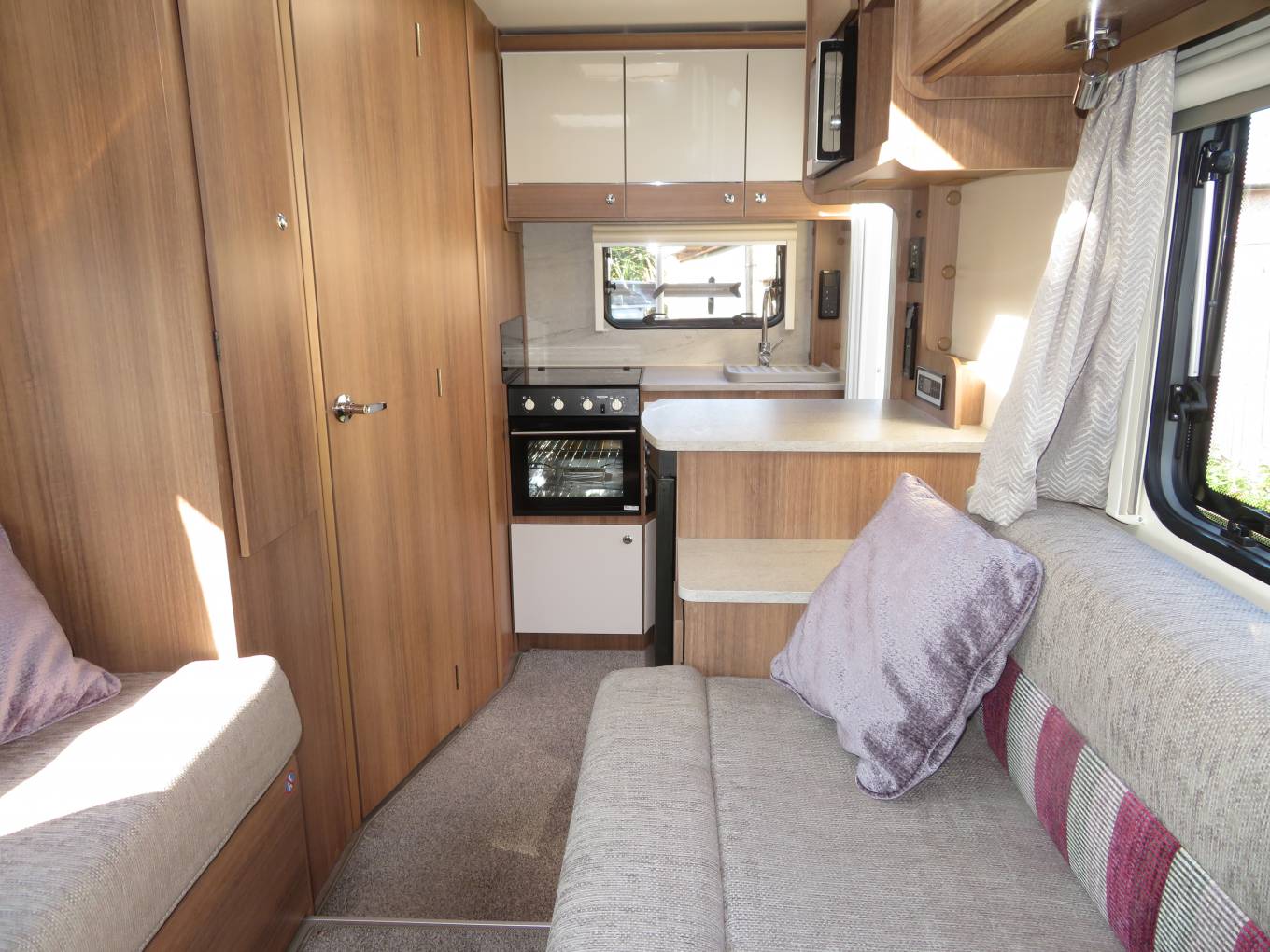 In the habitation area you have a spacious lounge area utilising two side sofas and the extremely comfortable captains chairs. This makes up the perfect spot to put your feet up and relax. There is a large sunroof and two good sized windows letting lots of natural light flood in. The Bailey also has a folding table that is cleverly stored under one of the side sofas which can be put up to make a wonderful place for up to 6 people to enjoy a meal or snack.