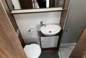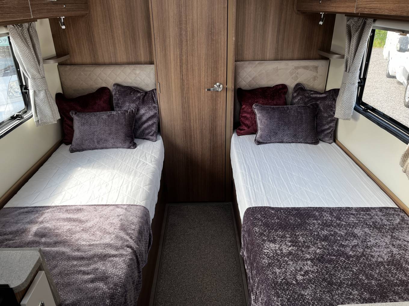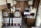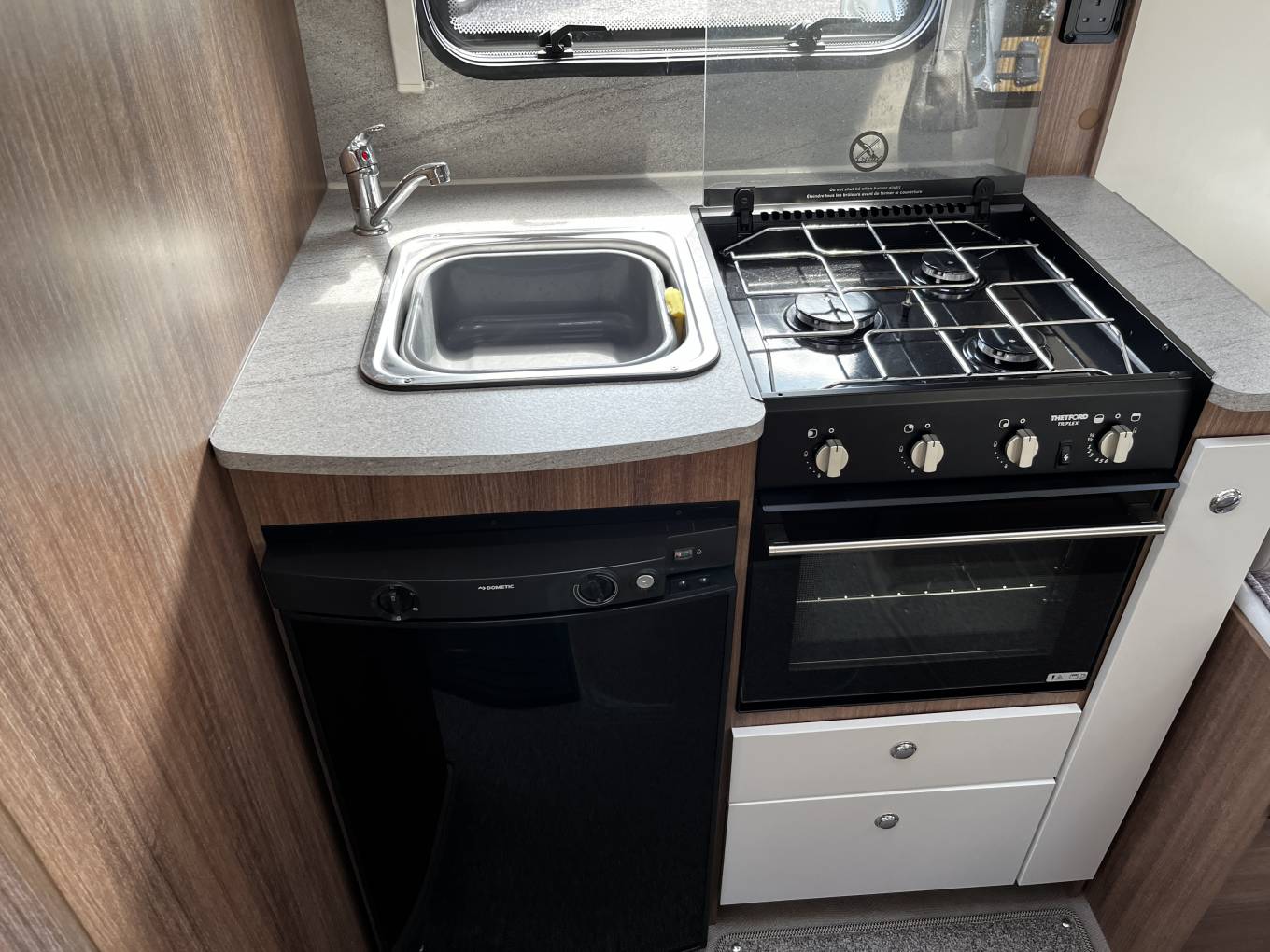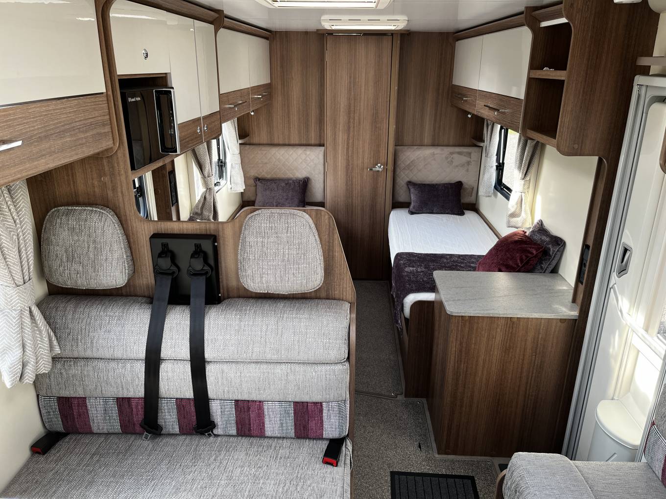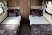Benefits include rear Single beds, Spacious end washroom with shower, comfortable lounge area with large table for Dining. Spacious Kitchen with microwave, grill, 3 ring hob and gas oven. Good size Dometic fridge with freezer compartment. Plentiful storage and lighting throughout. Curtains and blinds for privacy and fly screens for the warmer months.