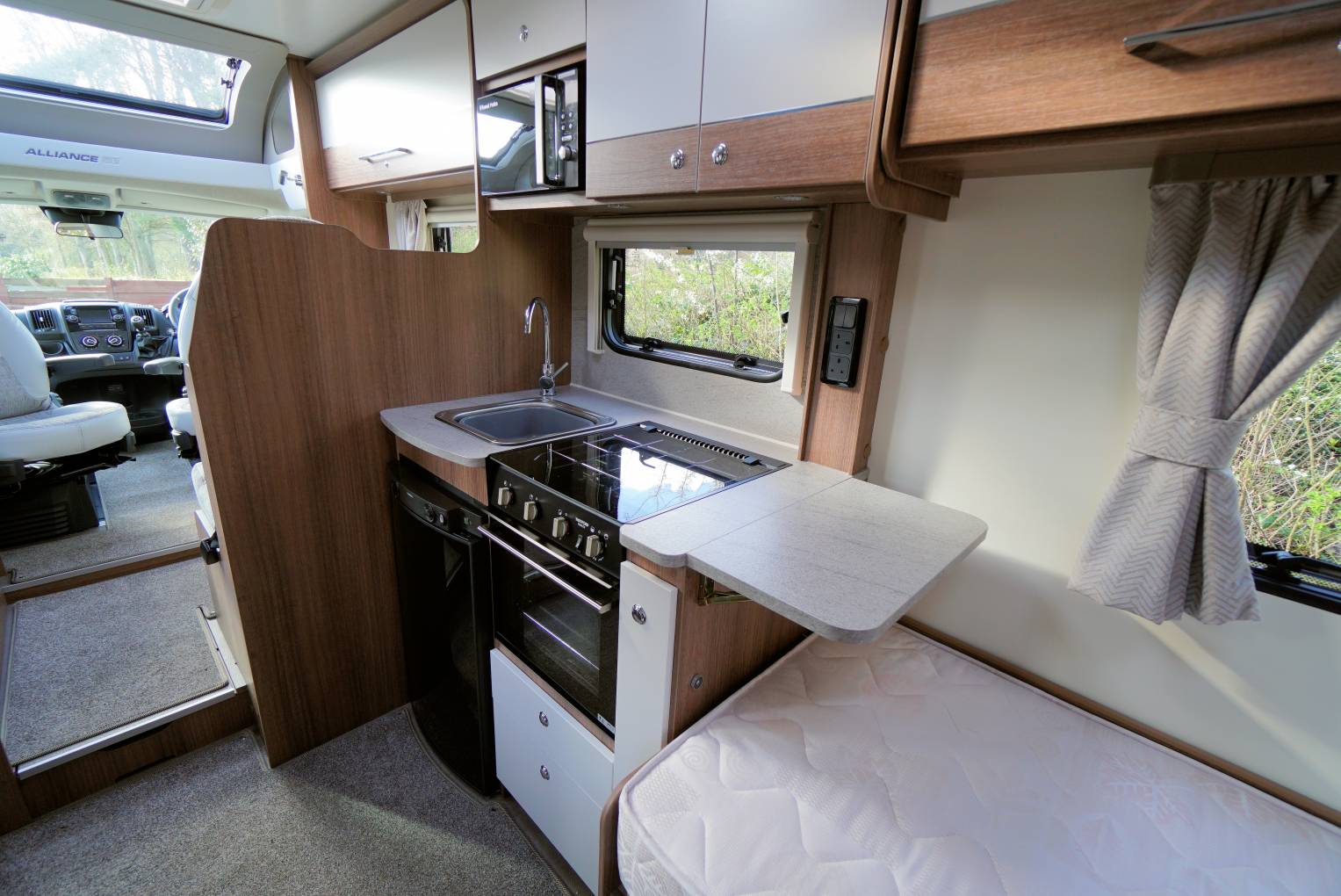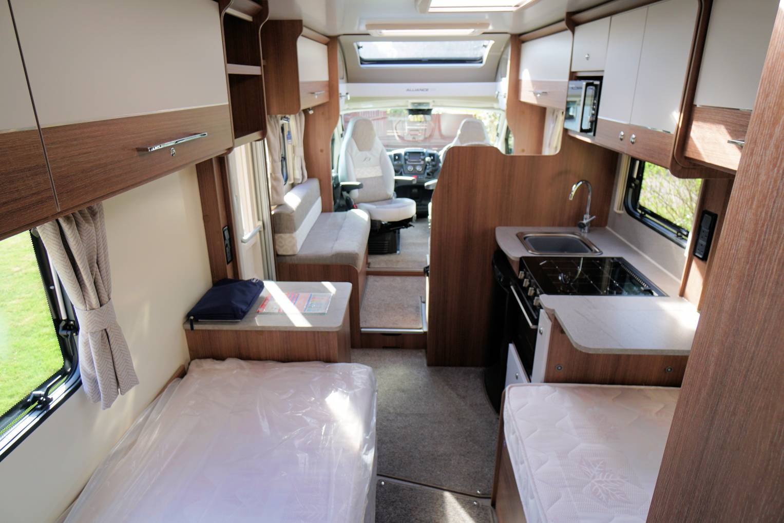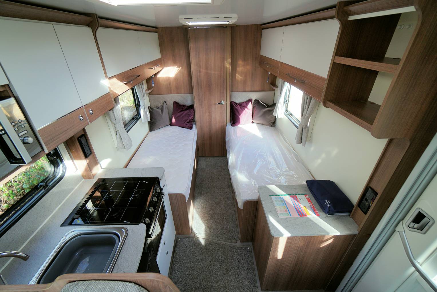 worktop extension. Behind the kitchen area are the two fixed single beds