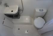 The final layout configuration is provided by a large toilet/shower room complete with a sink, mirror, cupboard and a Thetford cassette toilet.