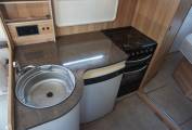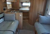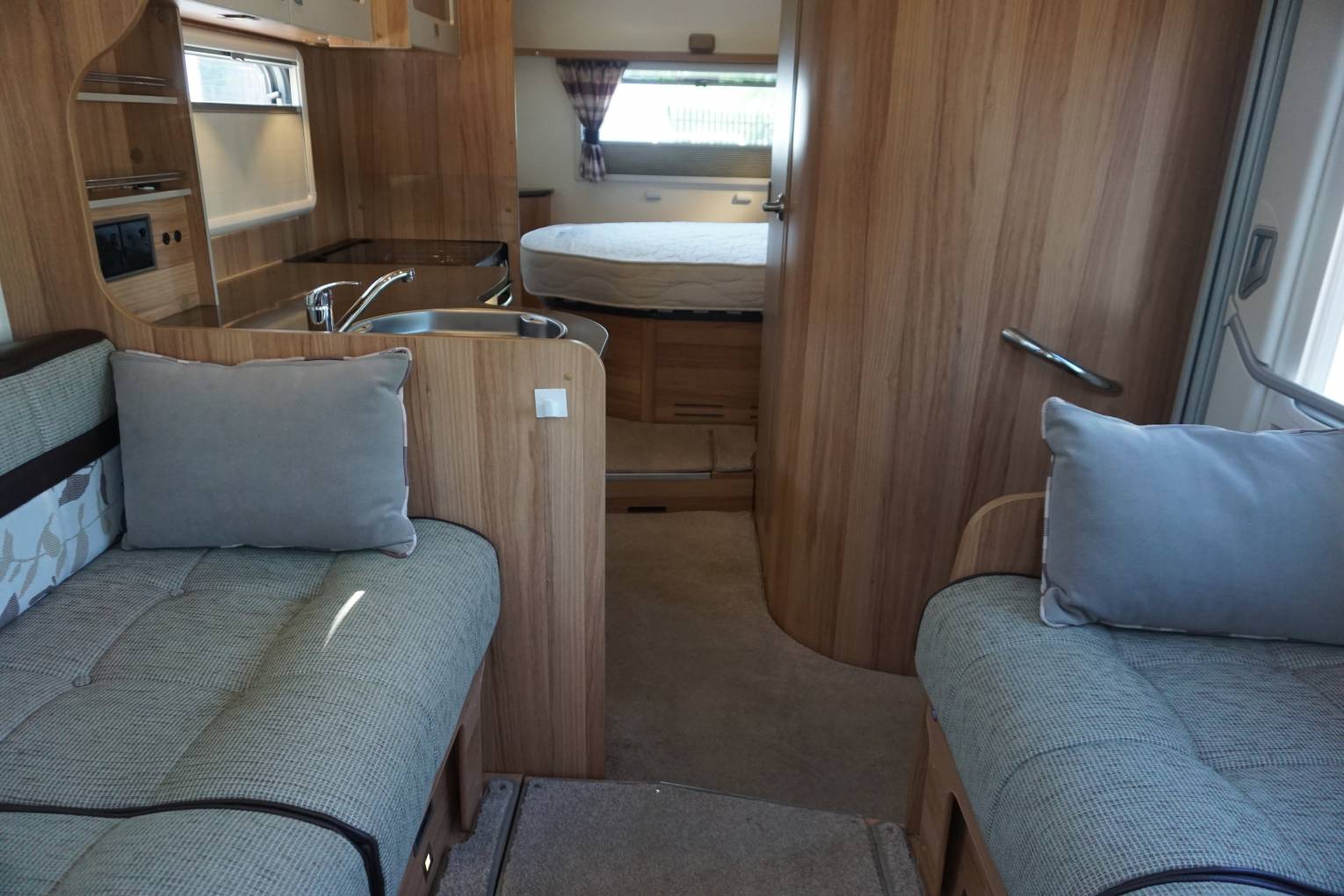 The layout consists of a front lounge providing ample space and comfort even with the free standing table in position. The centre kitchen area consists of 3 burner gas hob with electric hot plate, grill, oven, sink, and a large 3 way fridge.