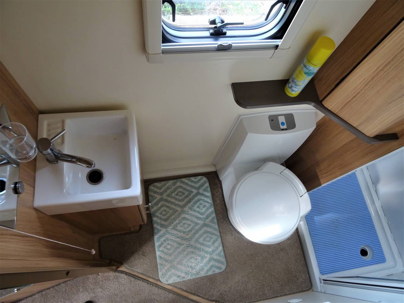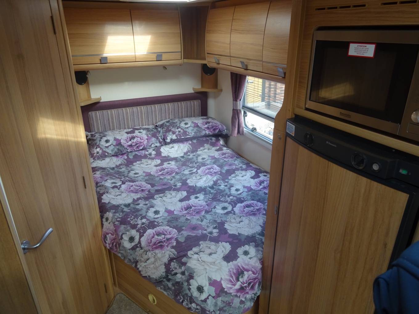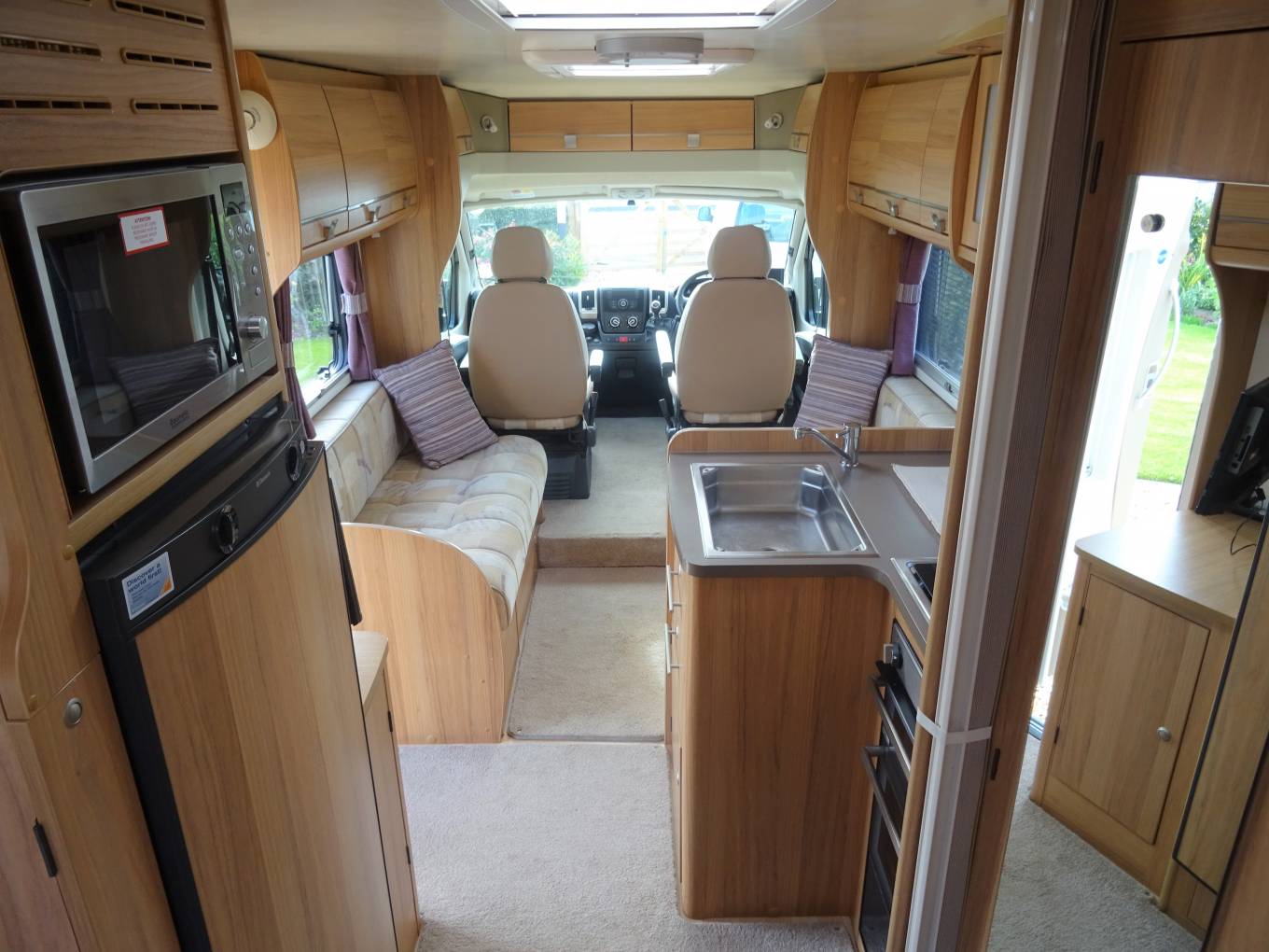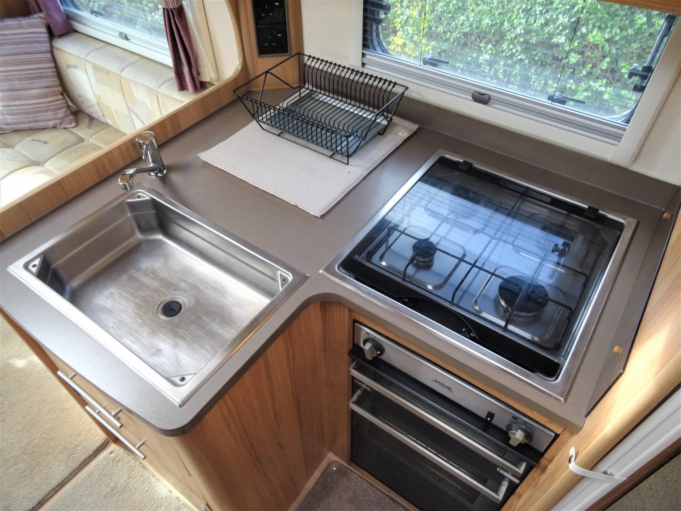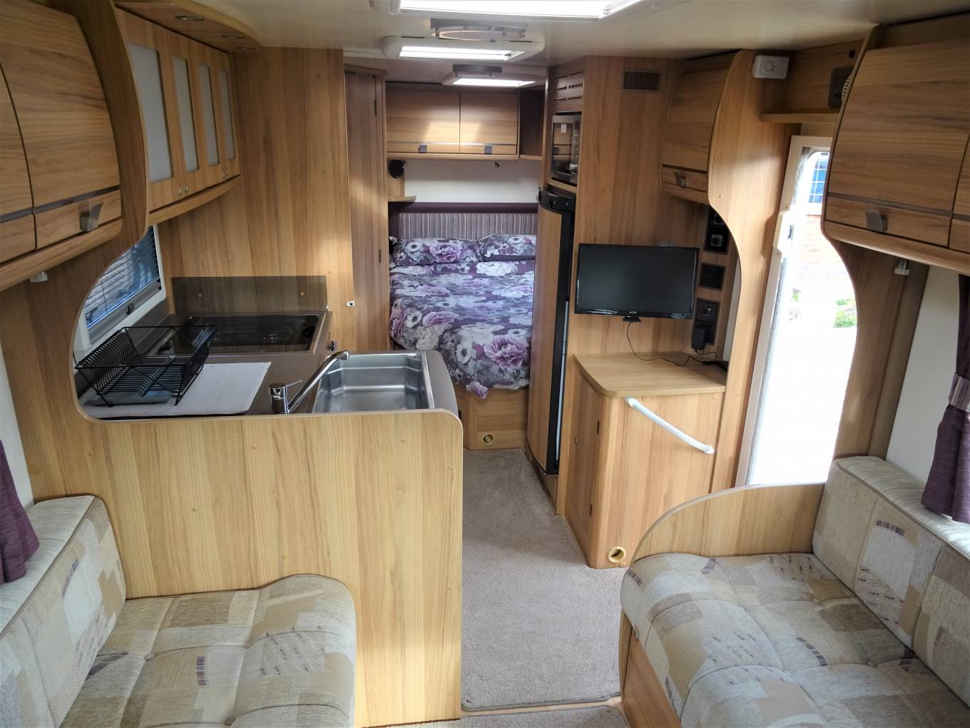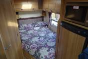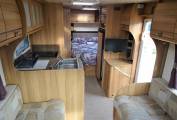 One of the beauties of the Bailey range is the interior feeling of space, partly due to the front swivel seats but equally due to the use of furnishings and fabrics that are light and cheerful. As we come to the centre lounge, there are a 2 single sofas down each side the slide out to make the extremely large second double bed. Also in this are is the flat screen Cello TV located in a excellent position for all to see.