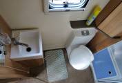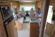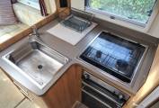 Moving through to the centre of the motorhome, there is a Thetford oven with 4 ring gas hob supplied from the refillable LPG tank located in the exterior storage unit. Next to the cooker is the sink with draining board and several drawers underneath. Opposite the cooker is the large Dometic fridge freezer with Baumatic microwave positioned just above.